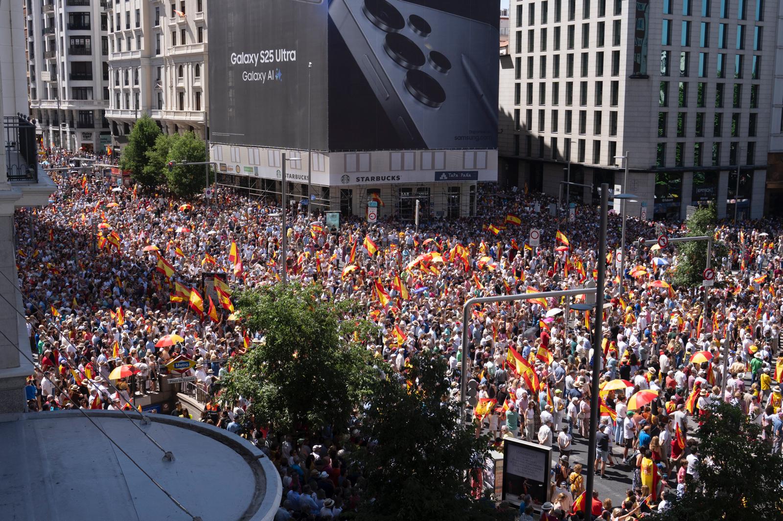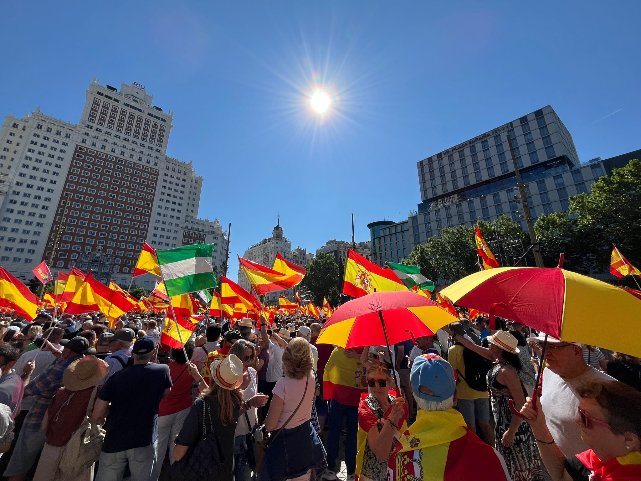 Bajo un sol implacable y con 29 grados en Madrid, los asistentes a la manifestación llenaron Plaza de España protegidos con sombreros, paraguas y banderas.