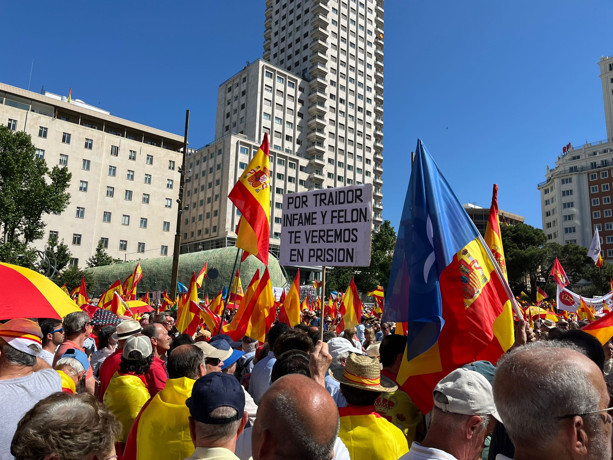 Una pancarta con el mensaje “Por traidor, infame y felón. Te veremos en prisión” destaca entre las banderas de España