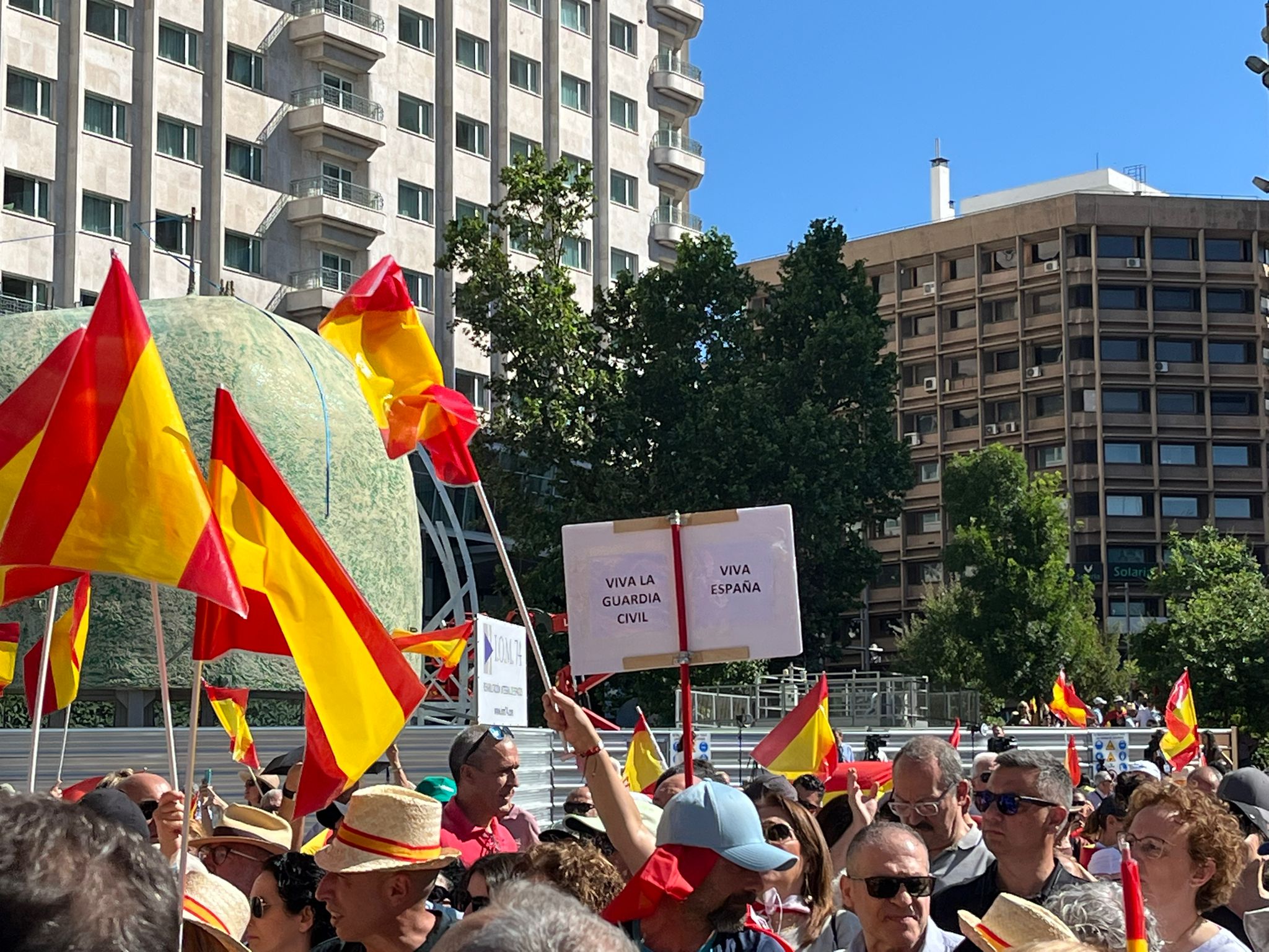 Una de las pancartas muestra el mensaje “¡Viva la Guardia Civil y viva España!”, mientras los asistentes corean “¡Sánchez, fuera del partido!” y “¡Sánchez, traidor y mentiroso!”.