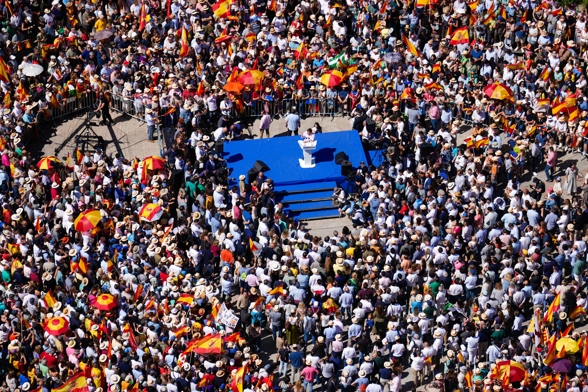 La imagen resume el éxito de la convocatoria por parte del líder del PP, Alberto Núñez Feijóo. Pese a todo, desde el PSOE hablan de "fracaso". Desde la formación socialista aseguran que "la respuesta de la calle a su estrategia ha sido raquítica".