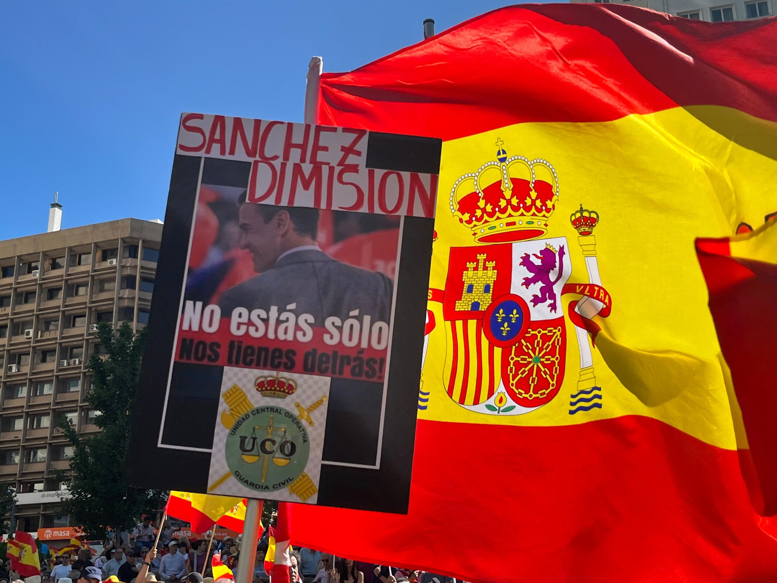 Pancarta con el mensaje “Sánchez dimisión” y “No estás solo, nos tienes detrás”, entre banderas de España durante la manifestación.