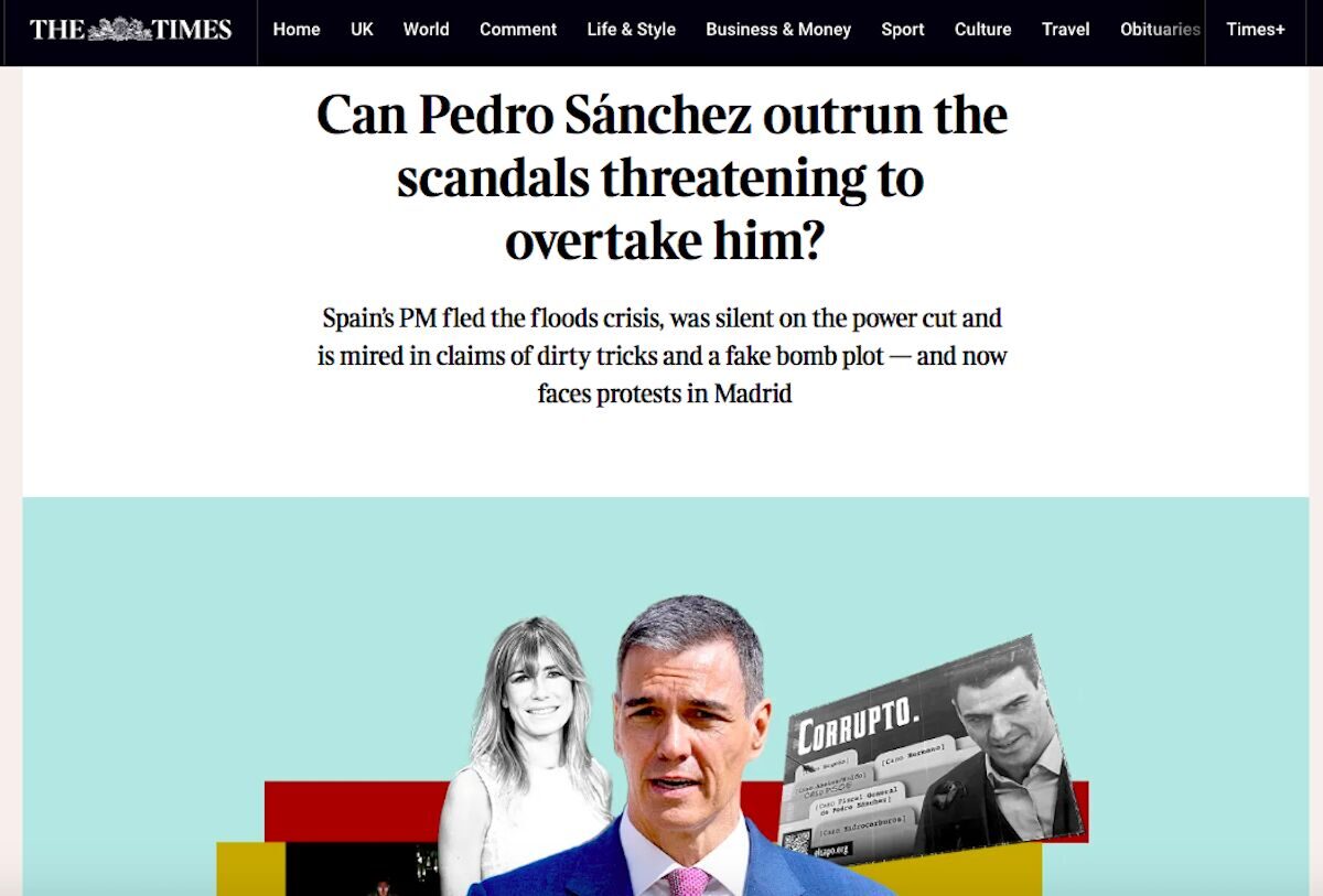The Times sentencia que Sánchez "sigue a la carrera" tras cuarenta días sin comparecer ante los medios tras el apagón que "paralizó a la península ibérica" y tras "el creciente escándalo de las cloacas" que "involucran al partido socialista" en una operación para tratar de incriminar "a la unidad que está investigando a la esposa, el hermano y la ex mano derecha del presidente". "Mientras el Gobierno habla de lawfare y campaña de acoso, Sánchez está viviendo su peor crisis desde su llegada al poder en 2018", sentencia.