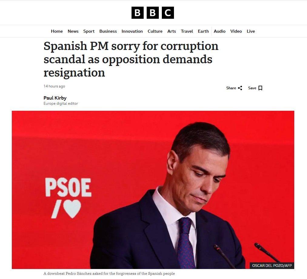 La BBC titula: “El primer ministro español se disculpa por el escándalo de corrupción mientras la oposición exige su dimisión". La televisión británica recuerda cómo Sánchez “se ha enfrentado a repetidas crisis políticas y en abril de 2024 amagó con dimitir".