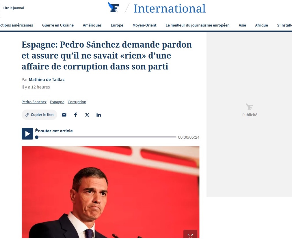 Le Figaro detalla que “Pedro Sánchez pide perdón y asegura que no sabía "nada" de un caso de corrupción en su partido".