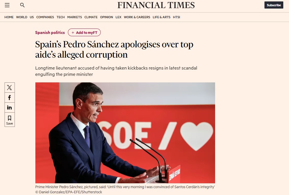 Por su parte, Financial Times, que hace sólo unos días se hizo eco del procesamiento de Álvaro García Ortiz, destaca que “Pedro Sánchez se disculpa por la presunta corrupción de su asesor principal".