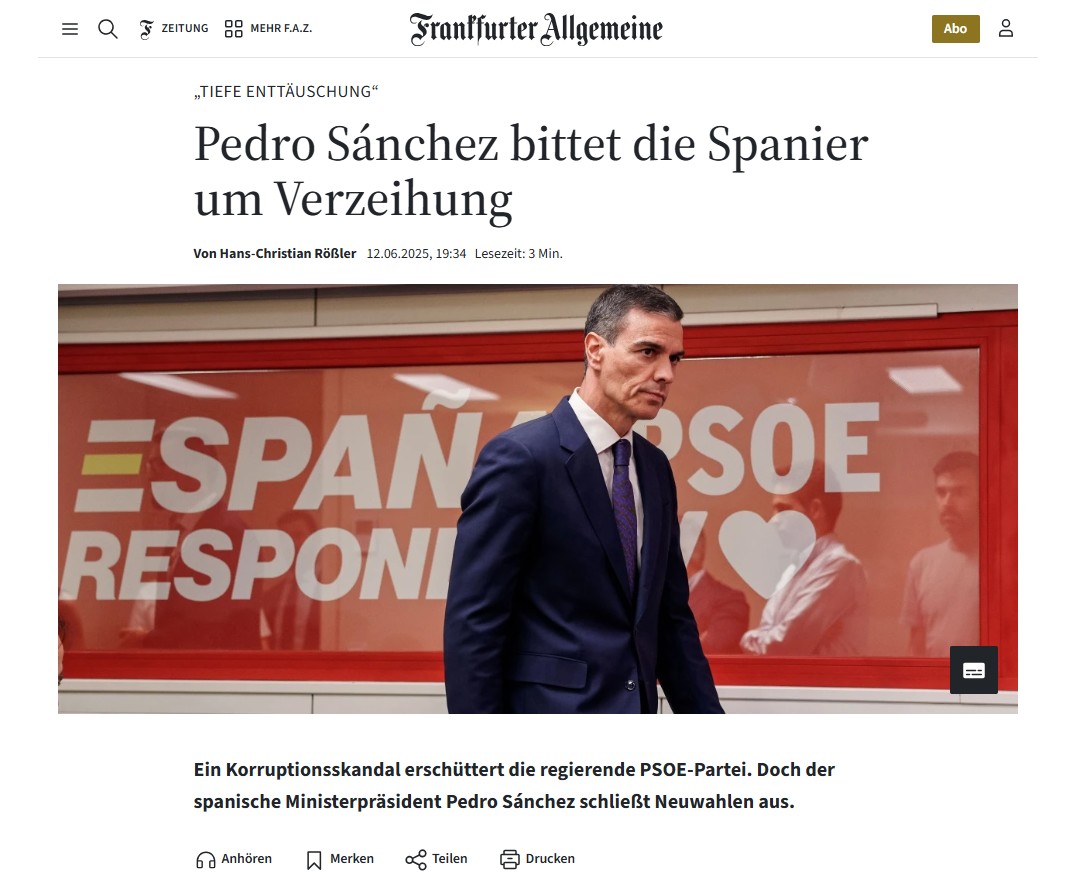 Frankfurter Allgemeine también detalla que “Pedro Sánchez pide perdón a los españoles" en un extenso artículo en el que repasa la ristra de escándalos que arrastra el presidente, desde su mujer al fiscal general y Leire Díez.