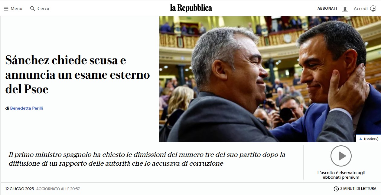 El periódico italiano La Reppublica subraya que “Sánchez se disculpa y anuncia una revisión externa del PSOE" con una foto que ilustra la extrema cercanía de Cerdán y el presidente.
