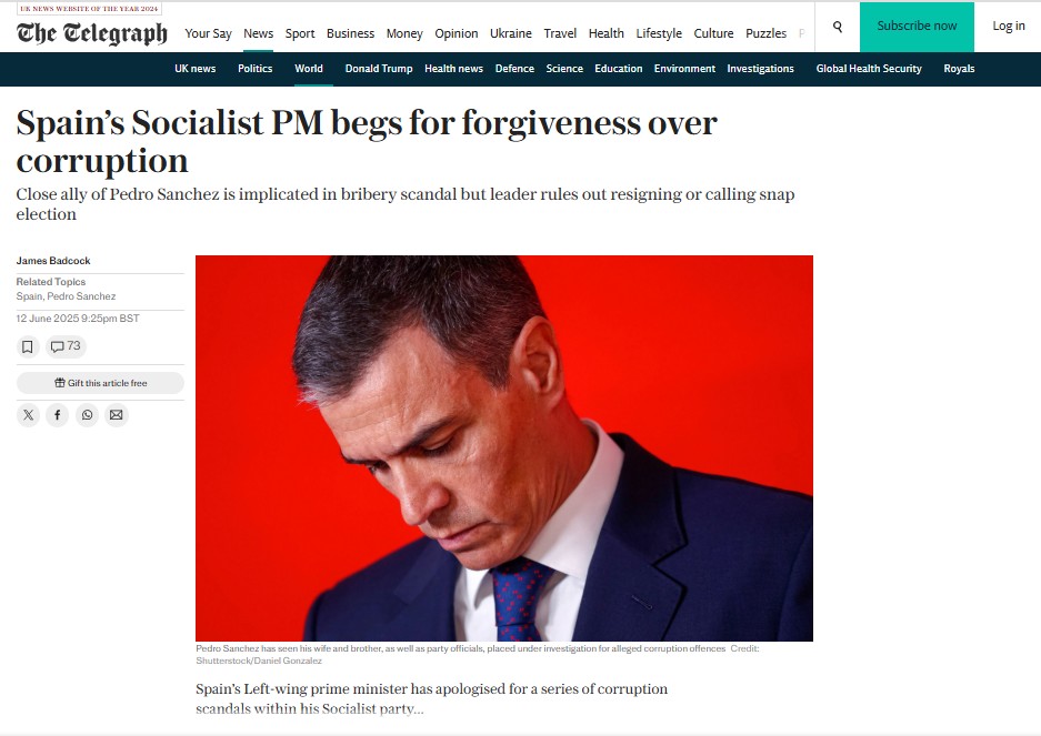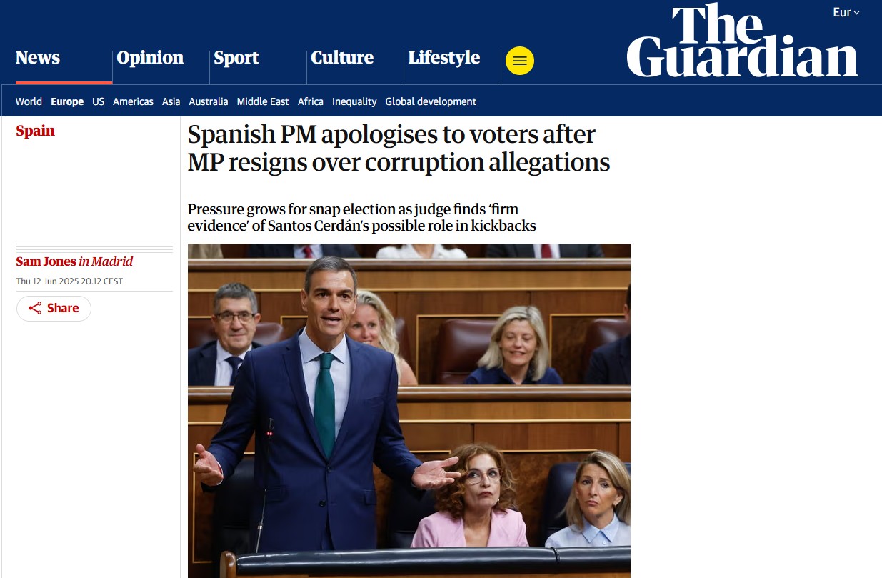 Asimismo, The Guardian explica que “el primer ministro español se disculpa con los votantes tras la dimisión de un diputado por acusaciones de corrupción" y subraya cómo se intensifican las acusaciones de corrupción contra el Gobierno español. “Crece la presión para un adelanto electoral al hallar un juzgado “firmes evidencias" del papel de Santos Cerdán", recoge.