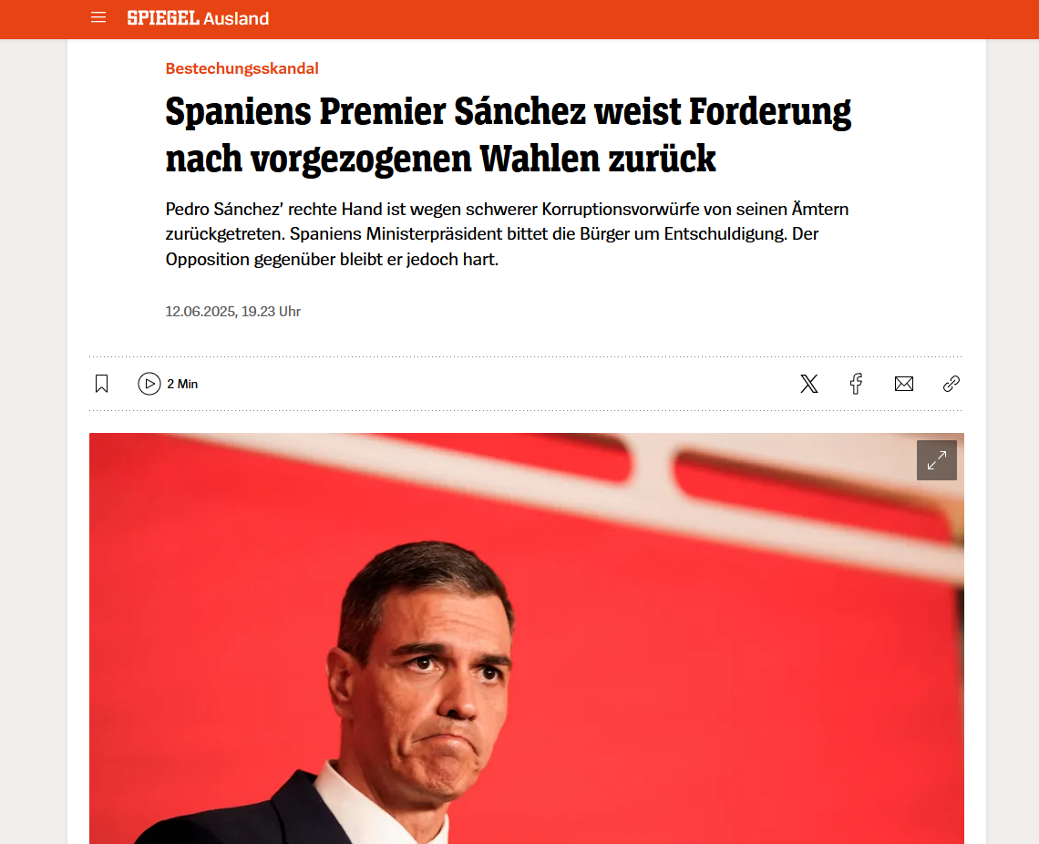 Artículo en Der Spiegel sobre Pedro Sánchez y sus disculpas: señala, tras aludir a los últimos escándalos, que el caso Santos Cerdán es "la mayor amenaza para la supervivencia de la frágil coalición de izquierdas".
