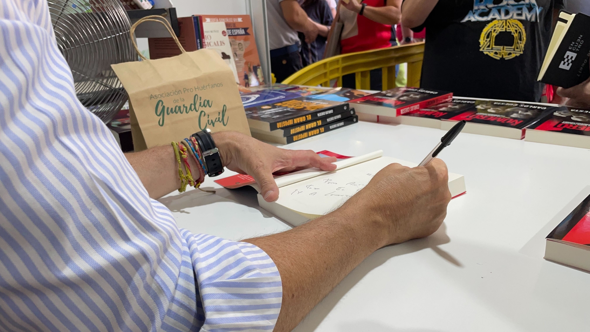 Carlos Cuesta firma un ejemplar de su nuevo libro ‘El Número 1’ a una de las seguidoras que acude hasta la caseta de la editorial La Esfera.