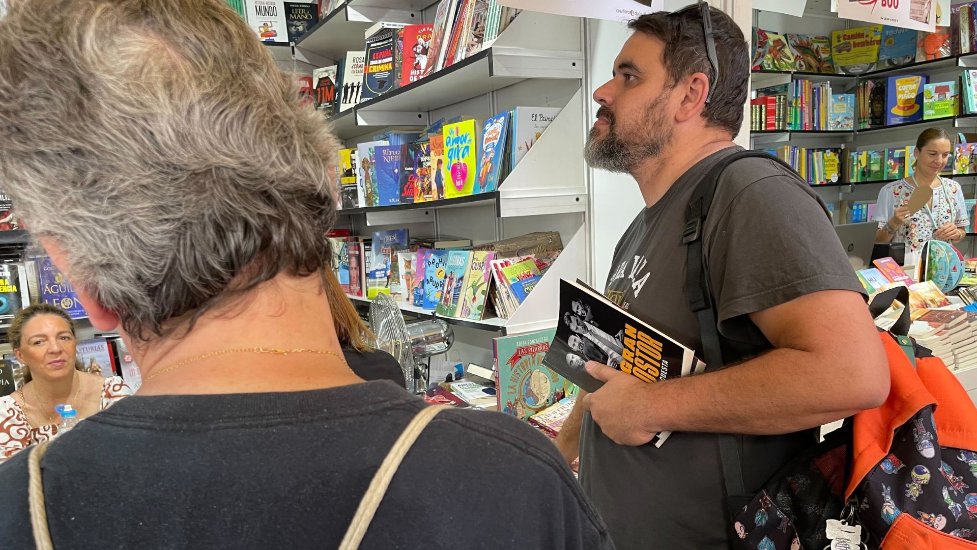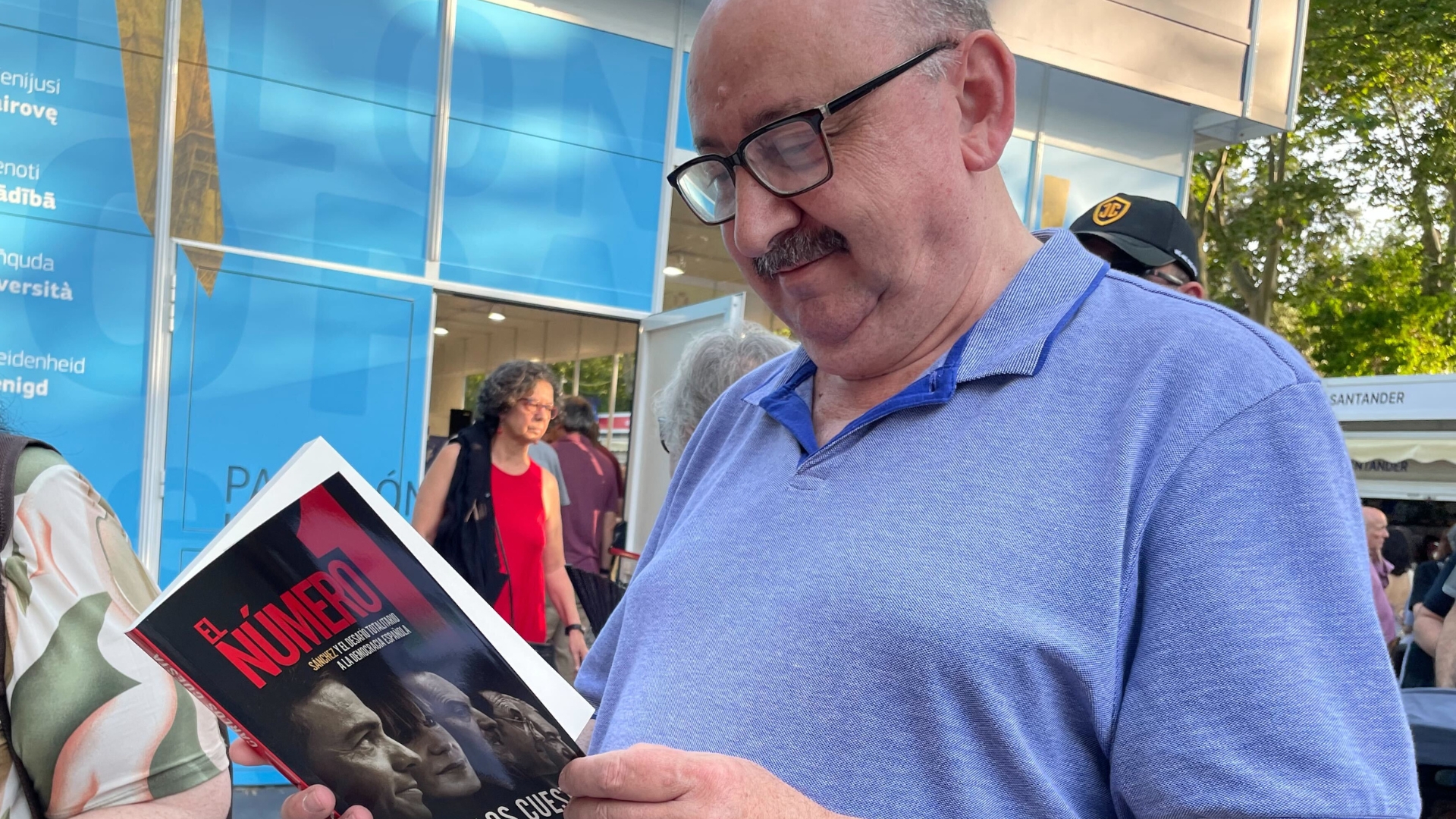 Un lector acude con 'El gran impostor', otro de los libros de Carlos Cuesta, a la firma del autor en la Feria del Libro.