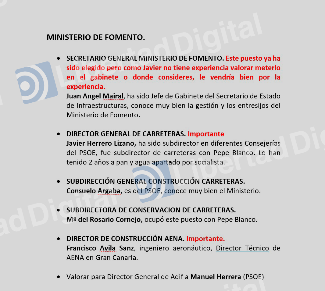 Sobre los nombres que aparecen en el documento, Ábalos acabó nombrando a Juan Ángel Mairal como coordinador para el Corredor Cantábrico - Mediterráneo y a Javier Herrero en la Dirección General de Carreteras como pedía Santos Cerdán. Respecto a Consuelo Algaba acabó siendo nombrada subdirectora General de Coordinación de la Dirección General de Carreteras que dirigía Javier Herrero, María del Rosario Cornejo fue designada directora técnica de la Dirección General de Carreteras y Francisco Ávila Sanz al que Santos Cerdán proponía como director de Construcción de Aena, fue elegido como director técnico de Aena en Gran Canaria.