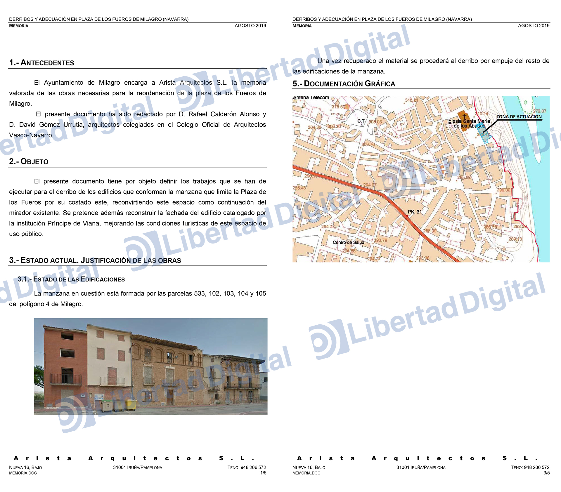 Según la memoria del citado proyecto, "el Ayuntamiento de Milagro tiene la intención de proceder al derribo de las edificaciones de la manzana descrita y destinar el solar disponible a un espacio libre público como continuación del mirador existente de valor turístico trascendente, y posterior reconstrucción de la fachada del edificio catalogado por la institución Príncipe de Viana en espacio público".