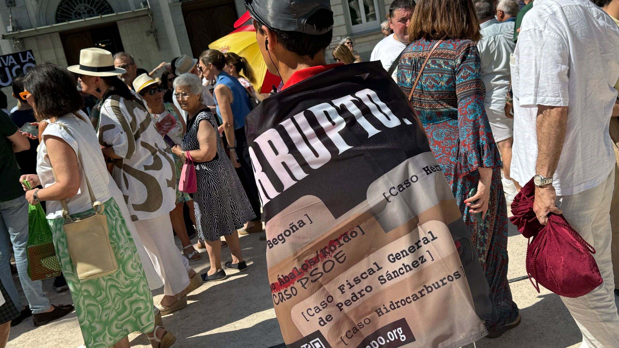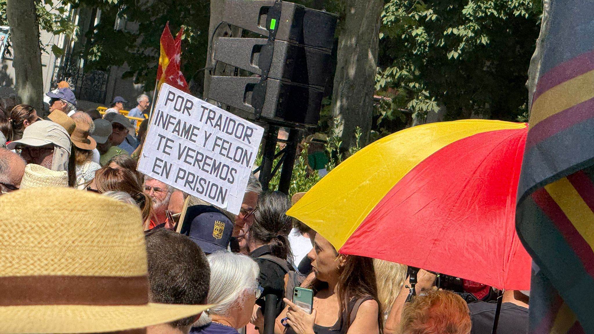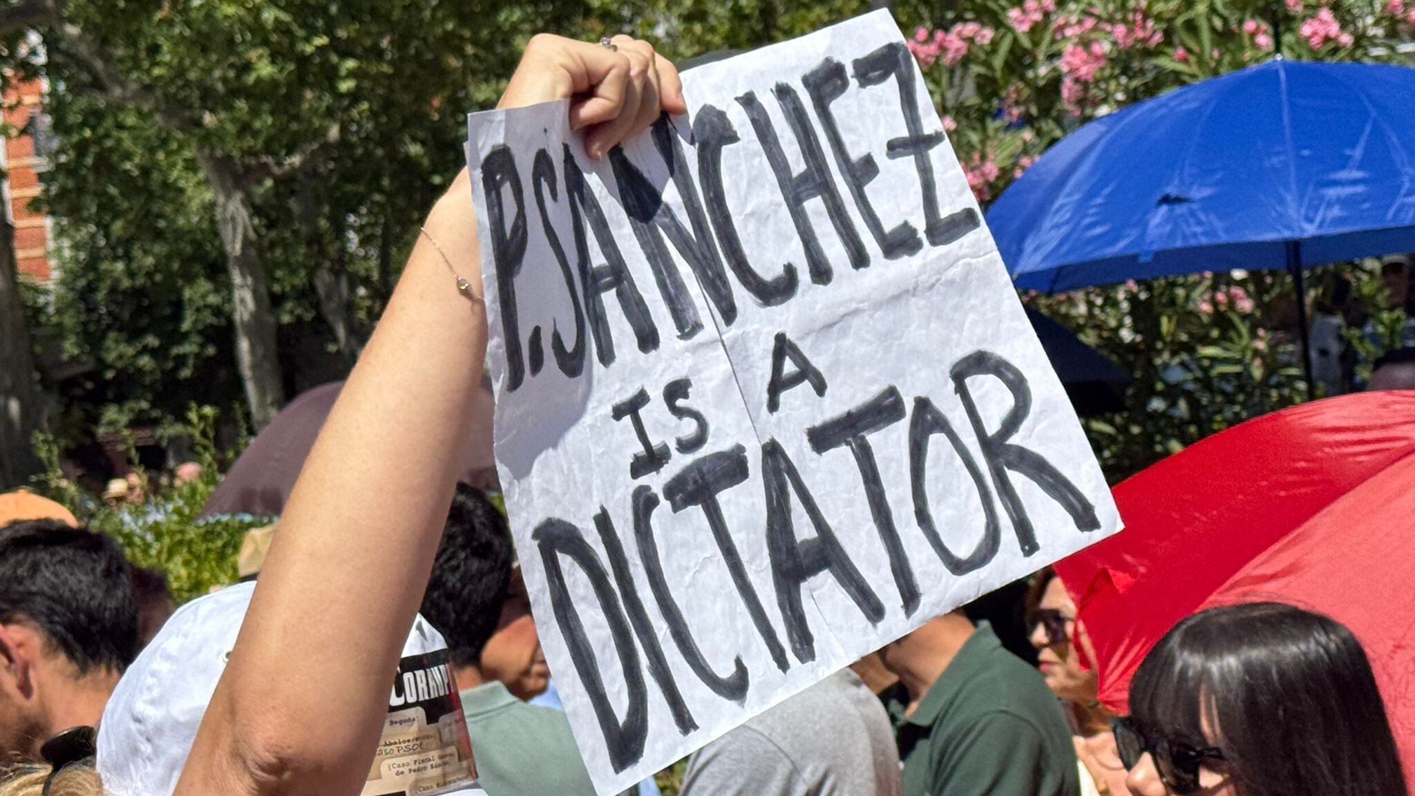 Algunas pancartas han mostrado mensajes especialmente duros contra el presidente del Gobierno, como la frase en inglés “P. Sánchez is a dictator" – "Pedro Sánchez es un dictador" –.