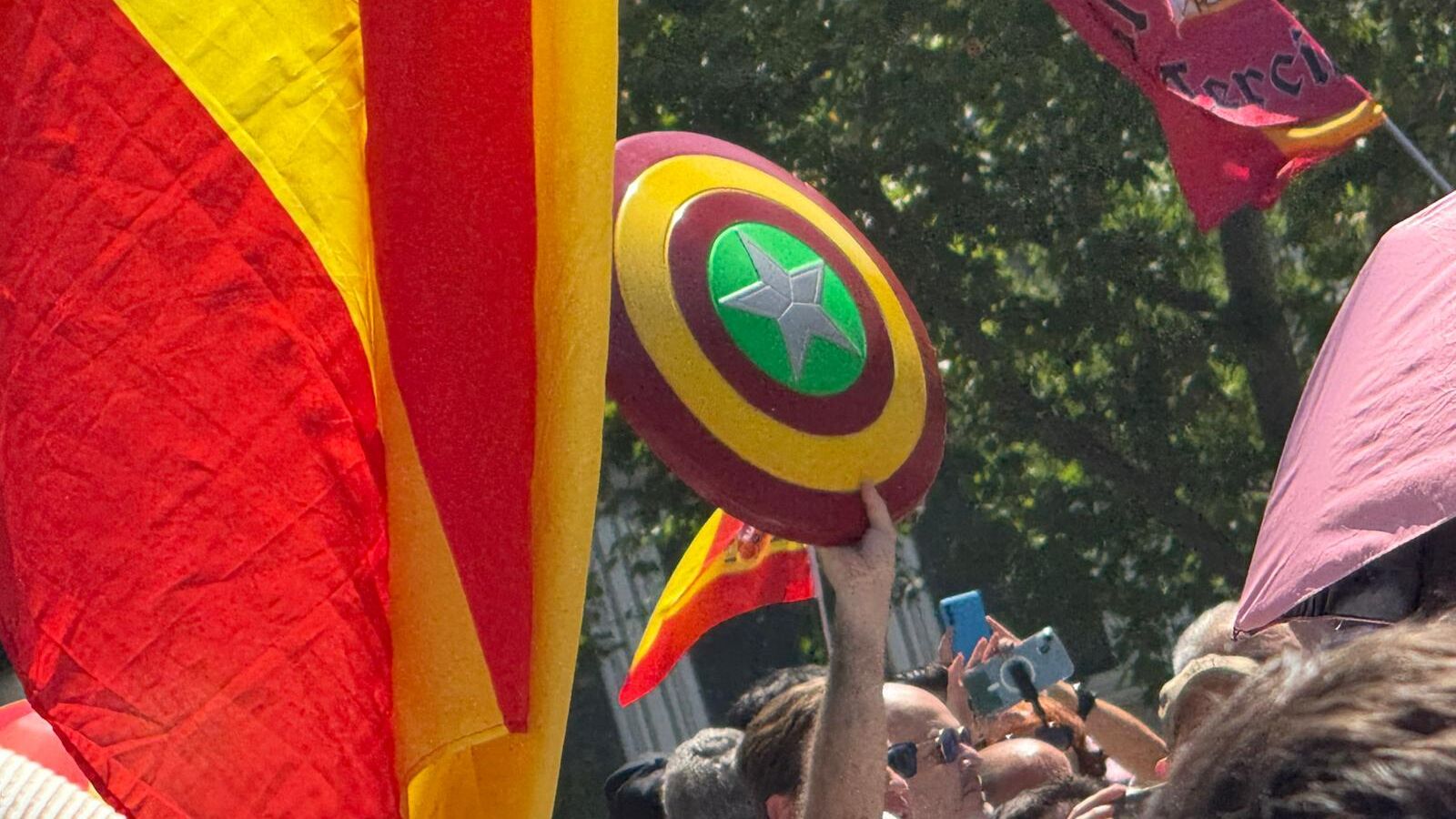 En medio de togas, pancartas y lemas, uno de los manifestantes ha destacado portando un escudo del Capitán América, el icónico símbolo del héroe que representa la defensa de la justicia y la libertad.