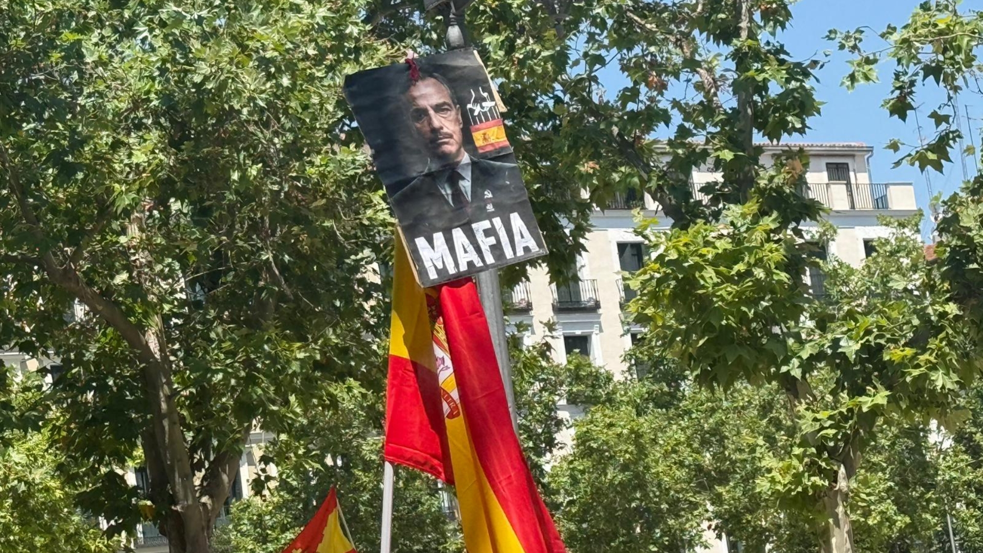 "Mafia" en letras grandes es la palabra que acompaña a una imagen de Pedro Sánchez, una acusación directa y profunda al presidente del Gobierno.
