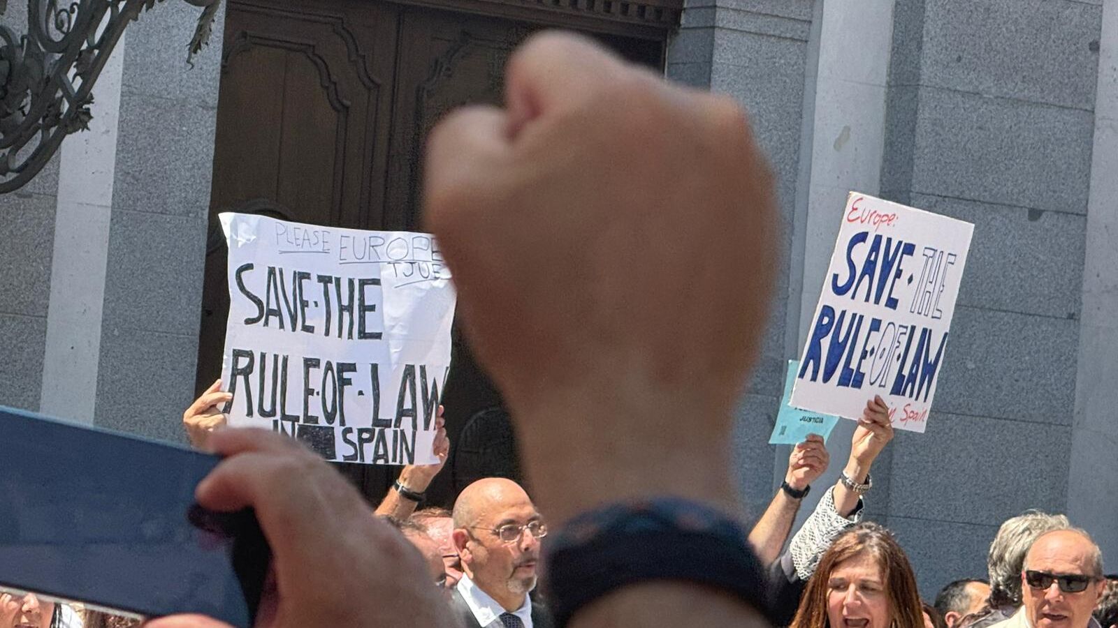 Los jueces y fiscales han pedido ayuda a Europa para "salvar el Estado de Derecho en España" con pancartas en inglés.
