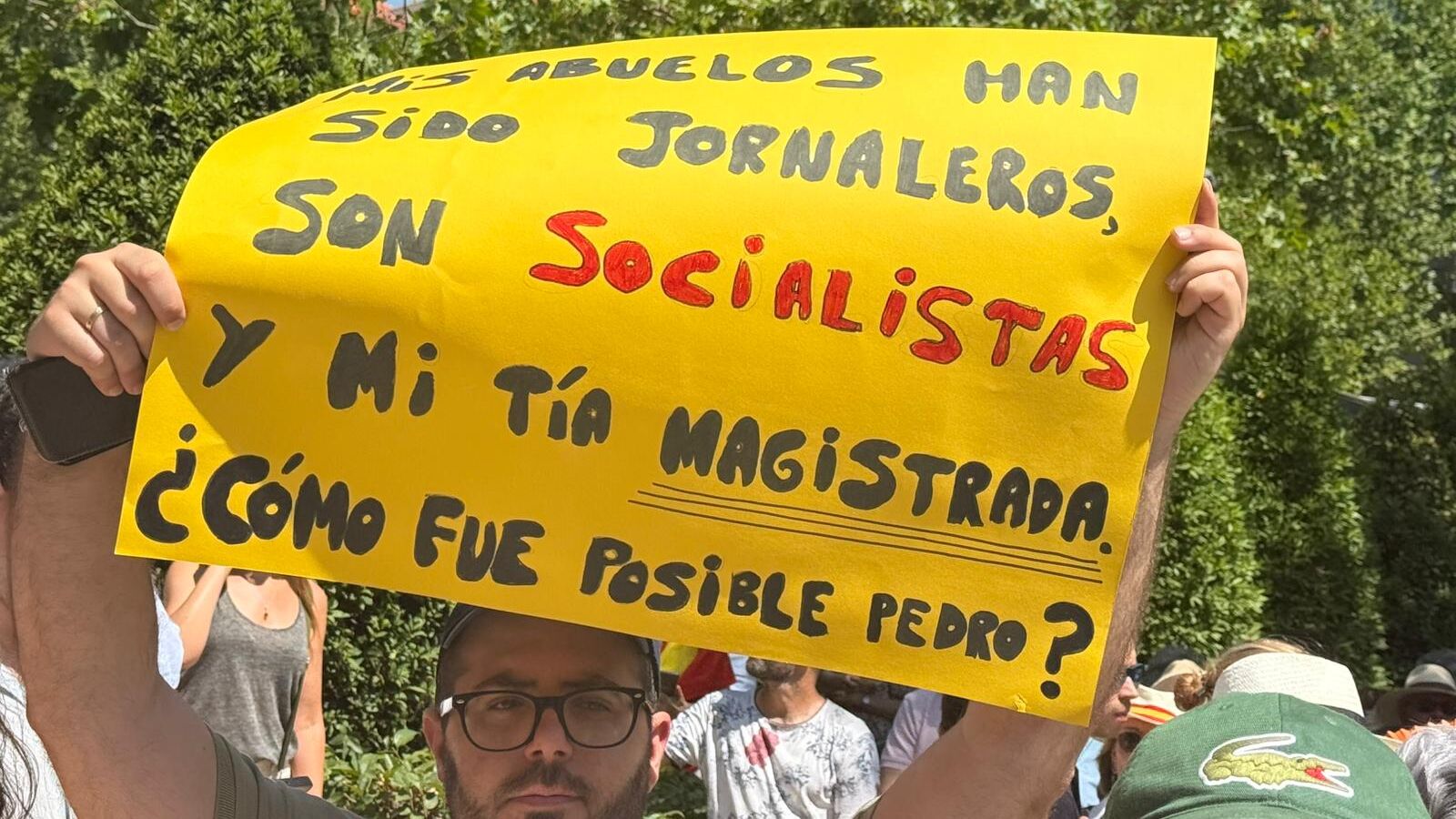 Entre las consignas más personales vistas hoy en la manifestación de jueces y fiscales destaca la frase: “Mis abuelos han sido jornaleros, son socialistas y mi tía magistrada, ¿cómo fue posible Pedro?