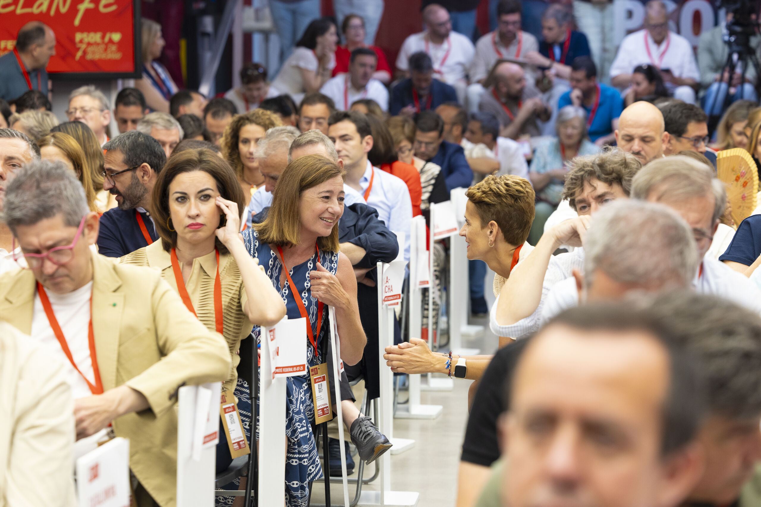 La presidenta del Congreso, Francina Armengol habla animadamente con María Chivite. La navarra volvió a llorar en el Comité Federal, según fuentes socialistas, mientras que la presidenta del Congreso podría afrontar nuevas revelaciones de la UCO.