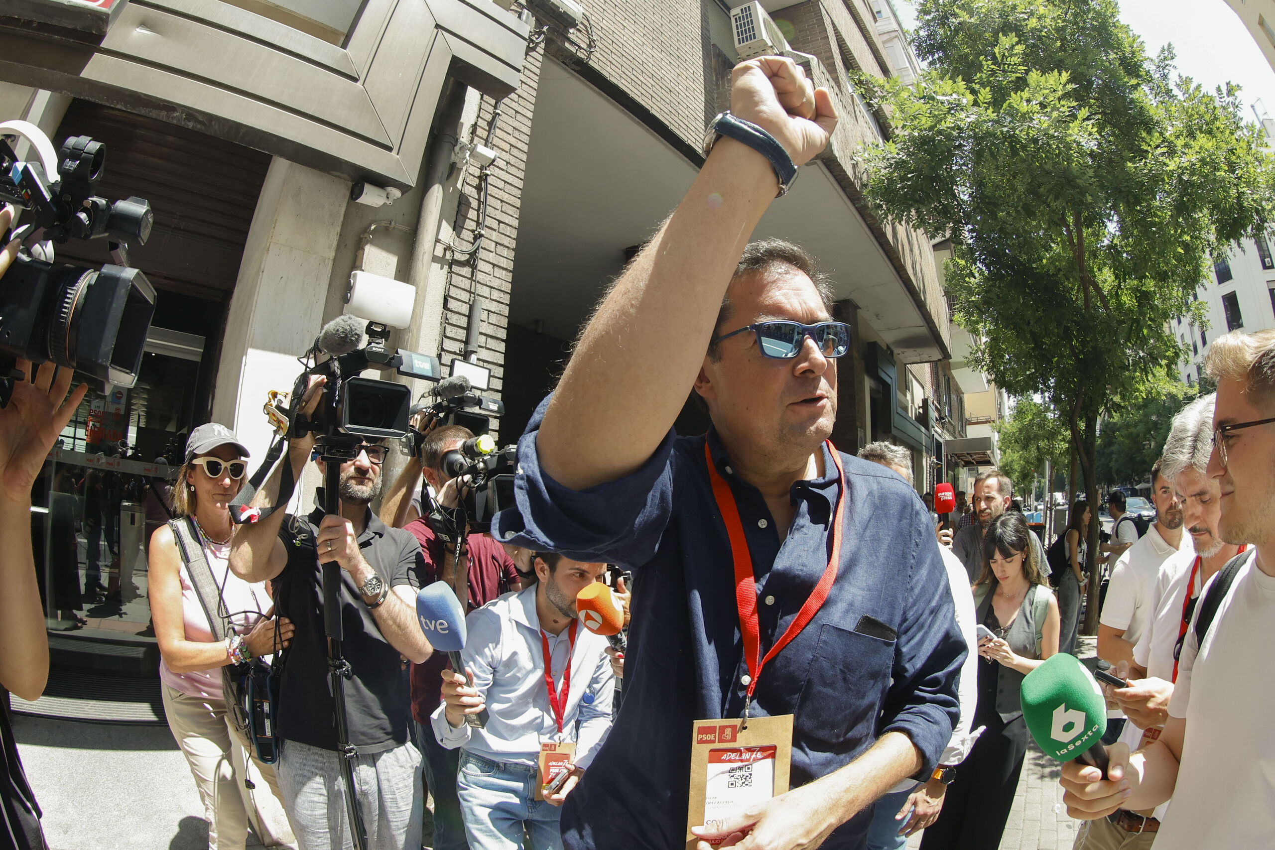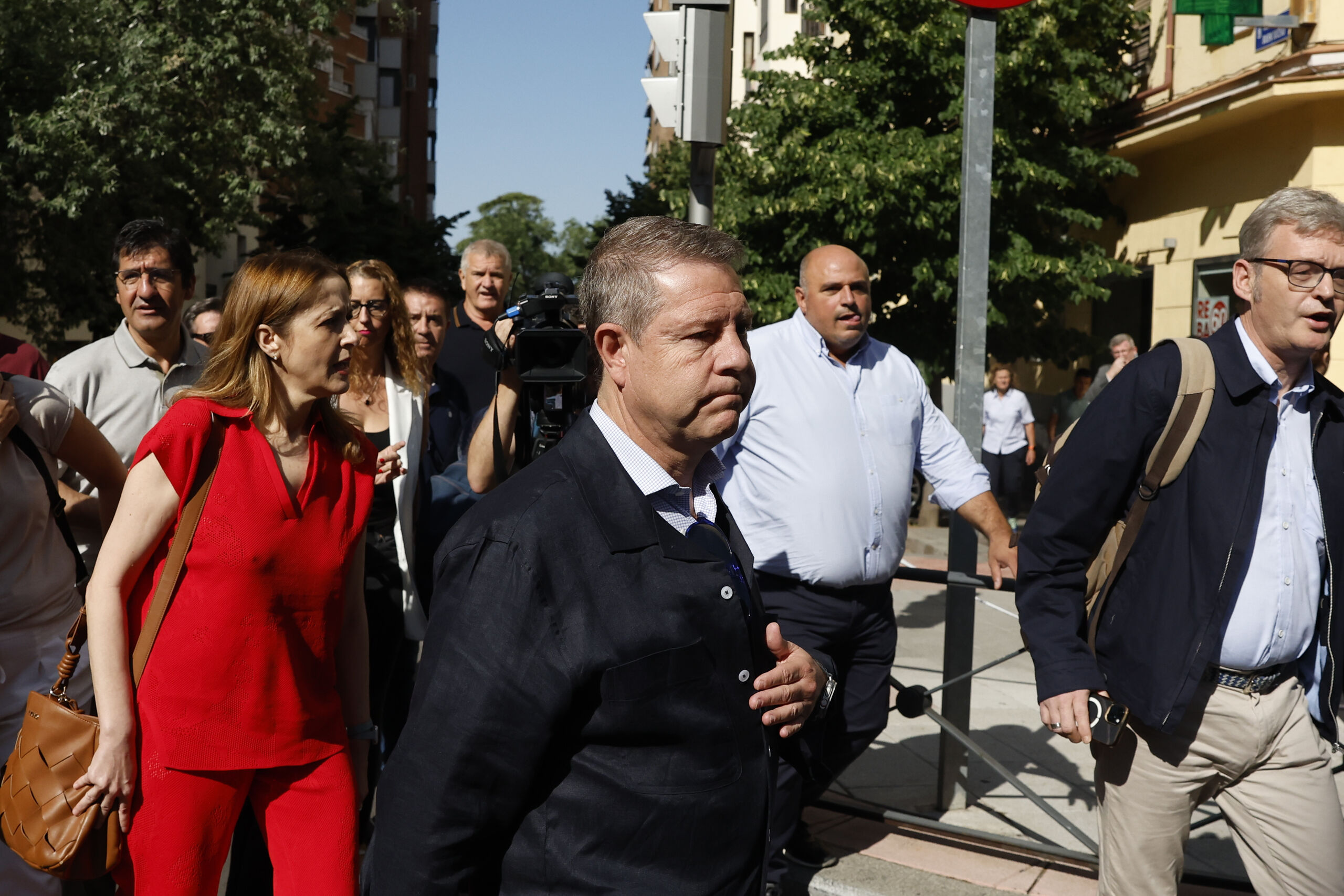 El presidente de Castilla-Mancha, Emiliano García-Page, con gesto serio a su llegada a la sede del PSOE en la madrileña calle de Ferraz. Allí sufrió los gritos de la limitada manifestación sanchista.