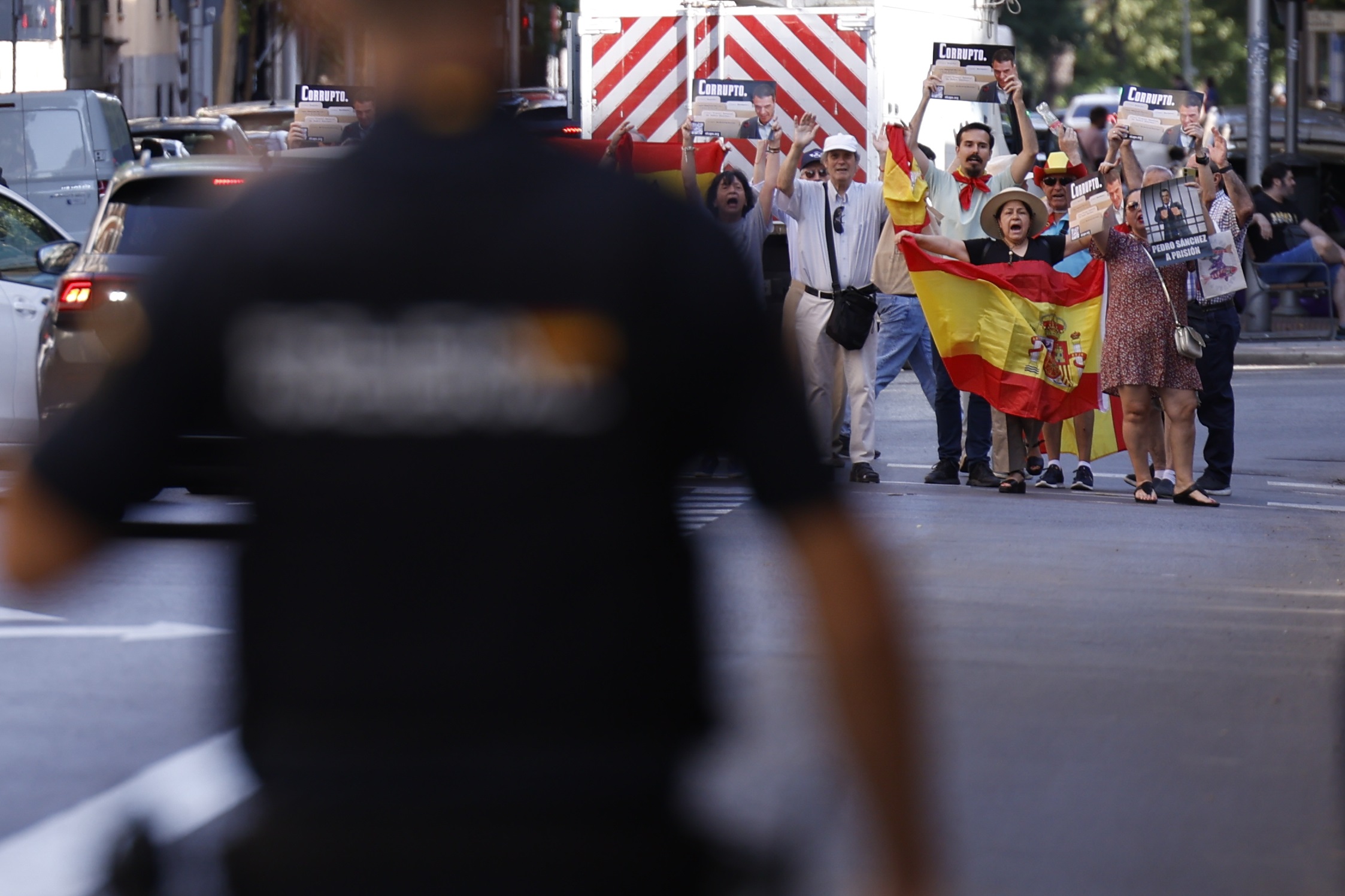 Este sábado hubo manifestaciones cruzadas (con muy escasa asistencia) en la calle Ferraz. En la imagen, varias personas protestan en contra del presidente del Gobierno mientras un autobús de Hazte Oír con el rostro de Sánchez recorría la calle.