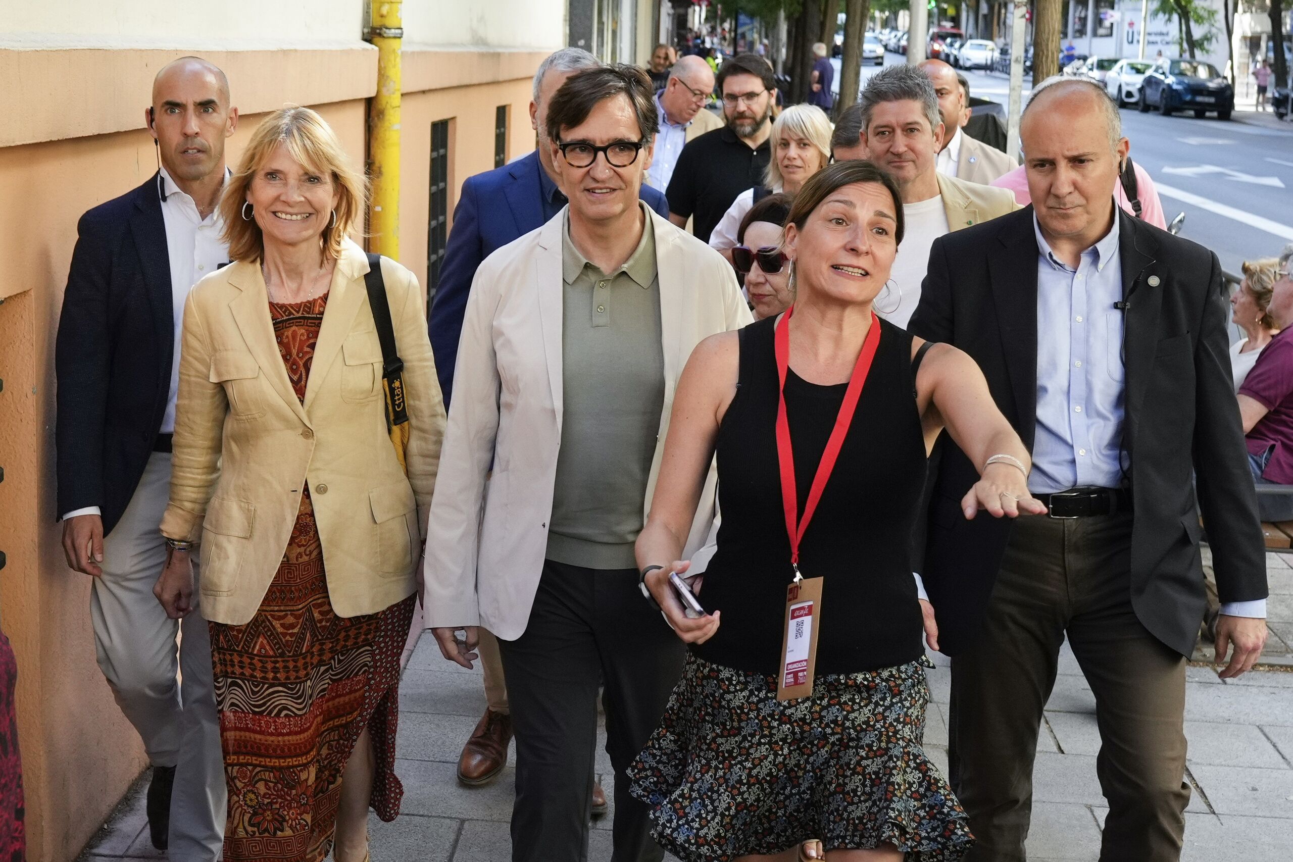El presidente de Cataluña, Salvador Illa, que ha vivido tensos debates en Cataluña por el informe de la UCO, llegando a Ferraz con su equipo