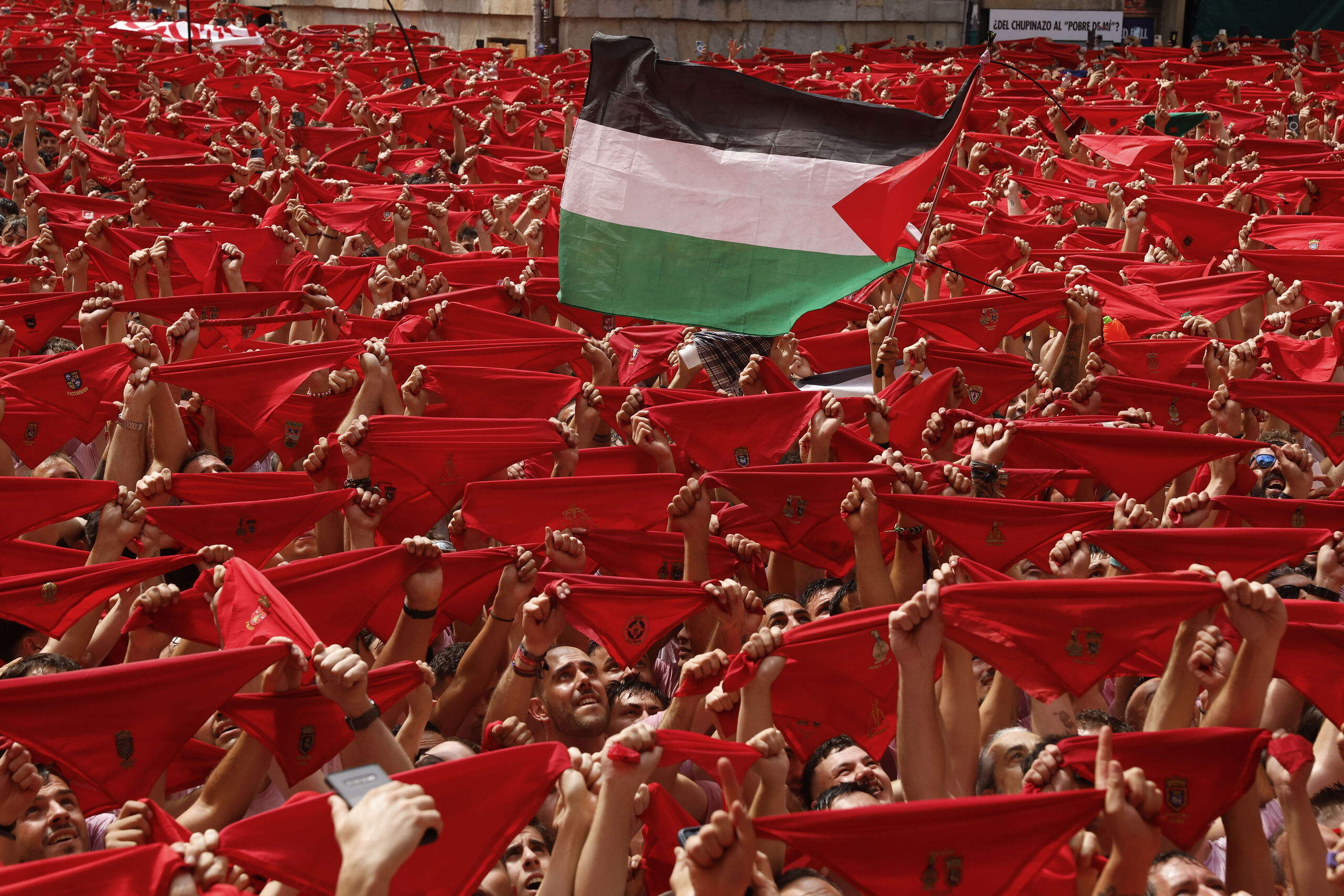 Este domingo han arrancado los Sanfermines con el tradicional chupinazo y un mensaje que se salía del habitual "Viva San Fermín". Lidón Soriano Segarra, Eduardo Ibero Albo y Dyna Kharrat Juanbeltz, representantes de la plataforma Yala Nafarroa, acompañaron el acto con gritos de Stop genocide y Por una Palestina libre antes de prender juntos la mecha del cohete ante una abarrotada plaza consistorial.