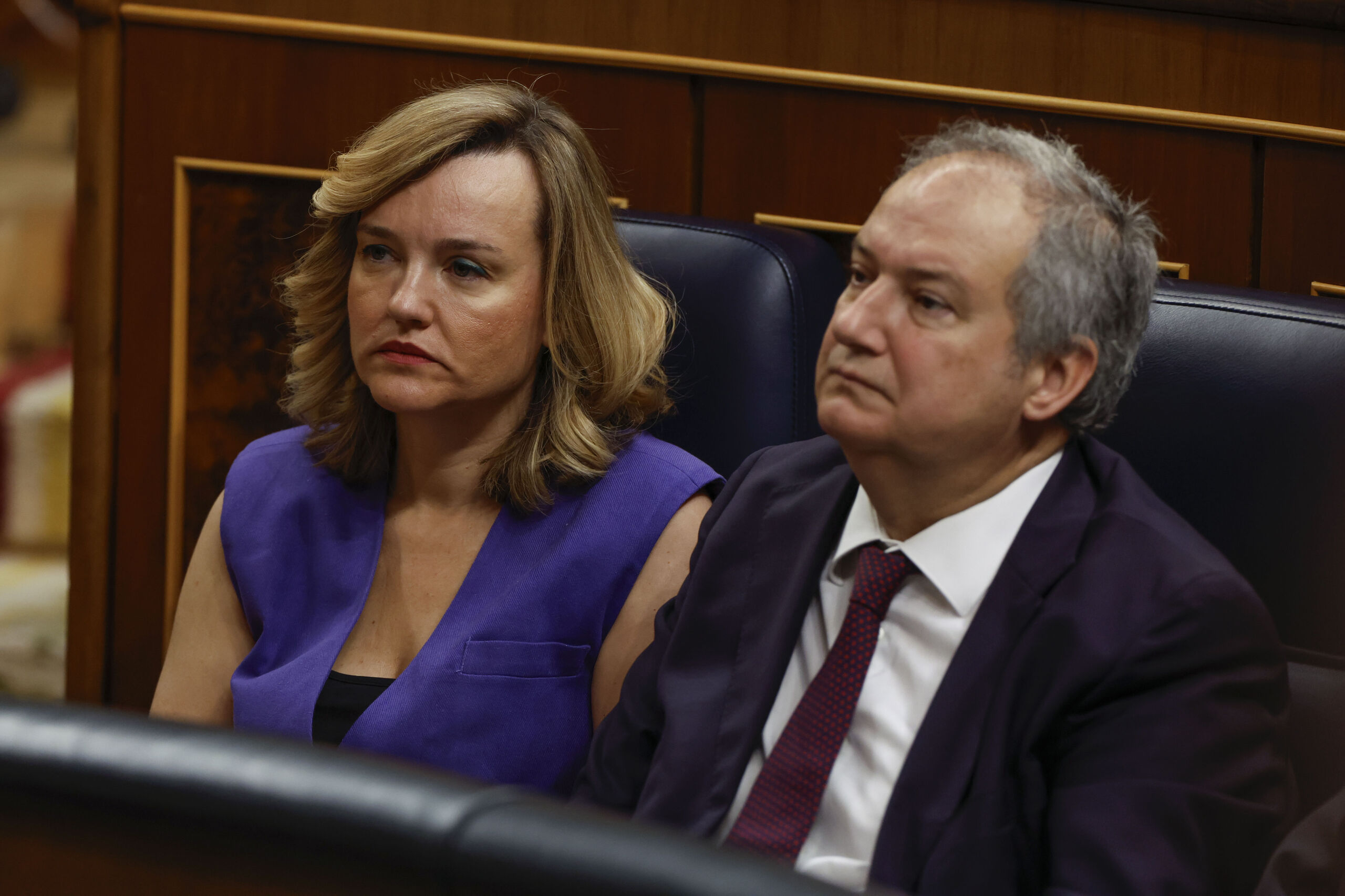 La ministra portavoz, Pilar Alegría, más seria que nunca en su escaño junto al ministro de Industria, Jordi Hereu.
