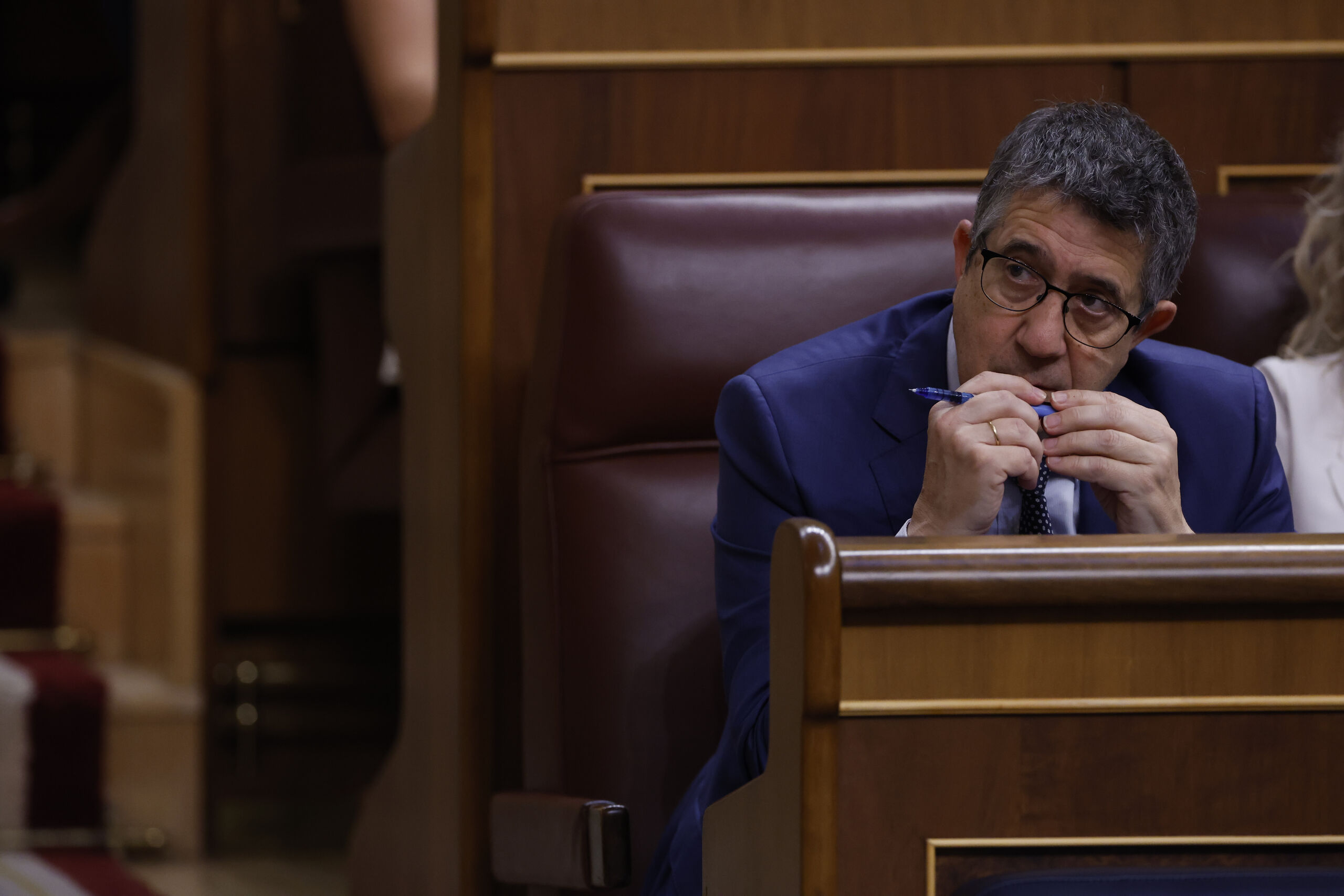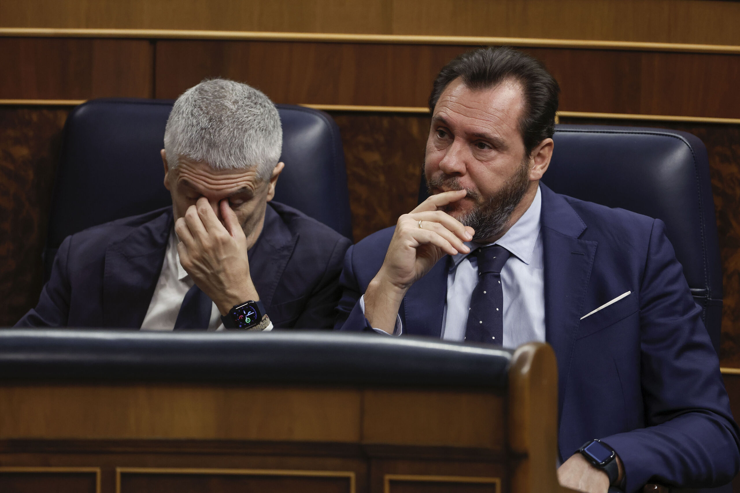 Elocuente gesto del ministro del Interior, Fernando Grande Marlaska, durante la intervención inicial de Pedro Sánchez, que volvió a pedir disculpas y a decir que no se irá. Junto a él, también muy serio, el ministro de Transportes, Óscar Puente, que también enfrente sus propias polémicas tras el caos ferroviario de hace unos días.