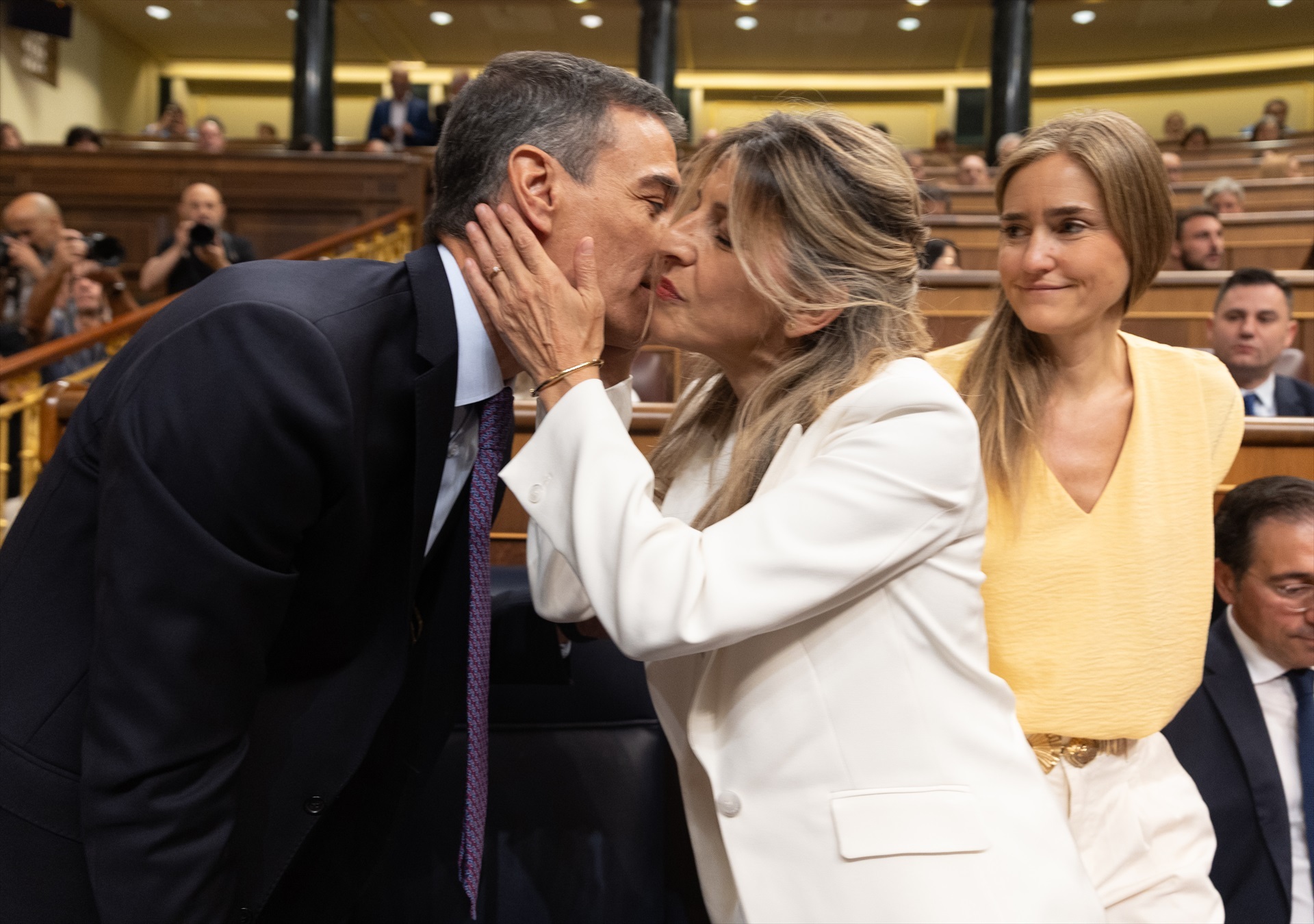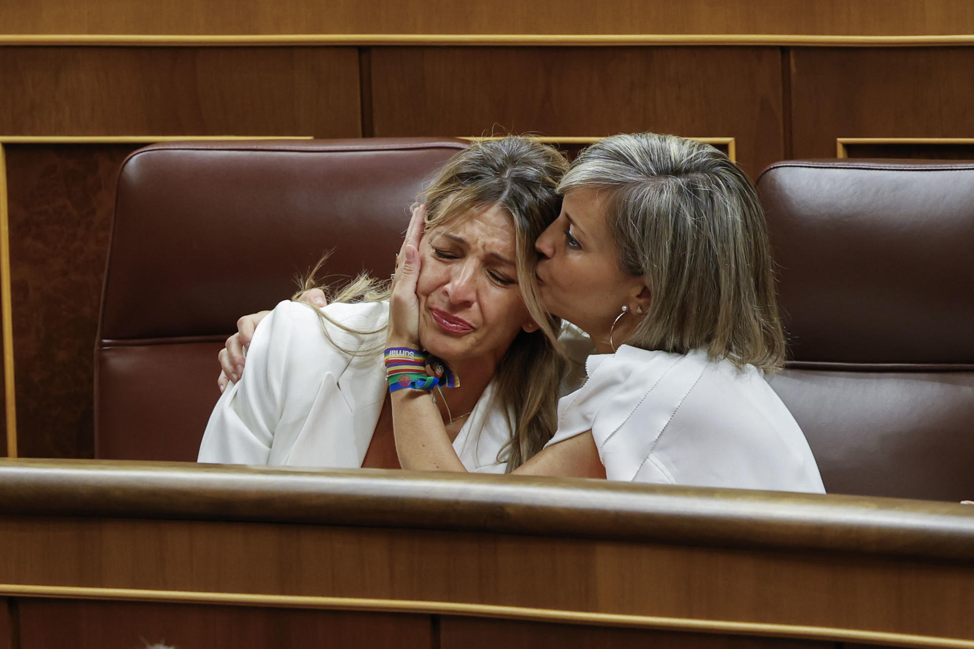 La vicepresidenta y líder de Sumar rompió a llorar cuando Sánchez mencionó la reciente muerte de su padre, el sindicalista Suso Díaz.