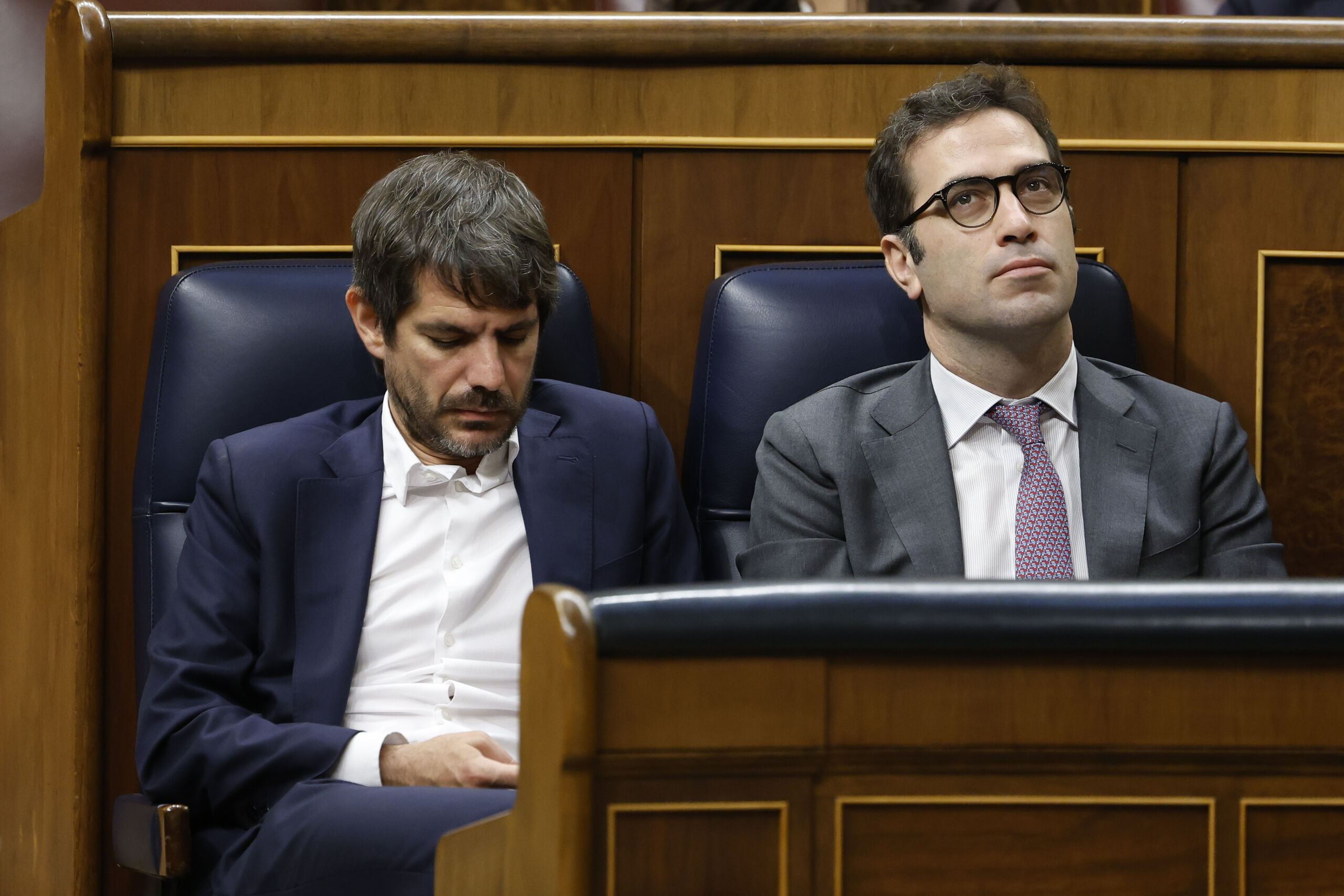 Ernst Urtasun, distraído con el móvil junto al ministro de Economía, Carlos Cuerpo.