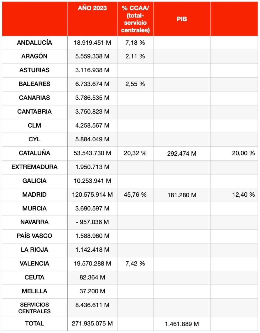 Los datos cerrados de la AEAT del año 2023 —los últimos definitivos— muestran el siguiente reparto de la recaudación significativa nacional de los impuestos por comunidades autónomas: en Andalucía se recaudó el 7,18% del total; en Aragón, el 2,11%; Baleares 2,55%; Cataluña 20,32%; Madrid 45,76% y Valencia 7,42%. Y esos datos no encajan en nada con el argumentario del PSOE.