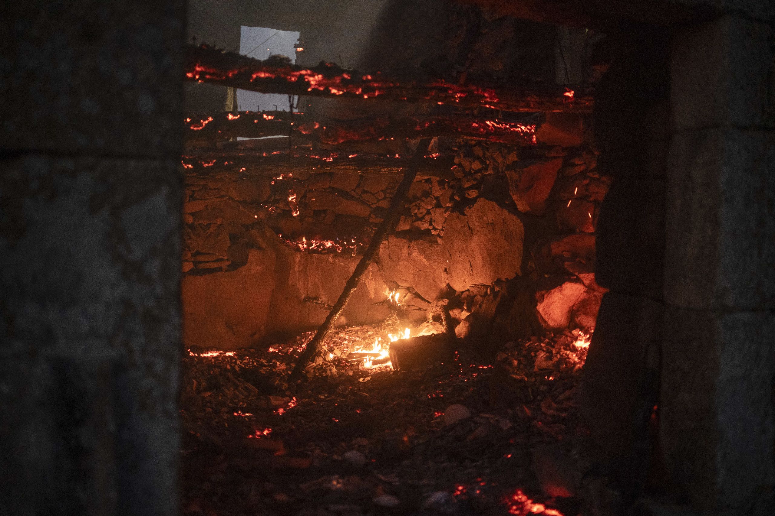 Casas calcinadas en la localidad de A Caridade, este miércoles en el municipio de Monterrei (Ourense). Fotografía del 13/08/2025.
