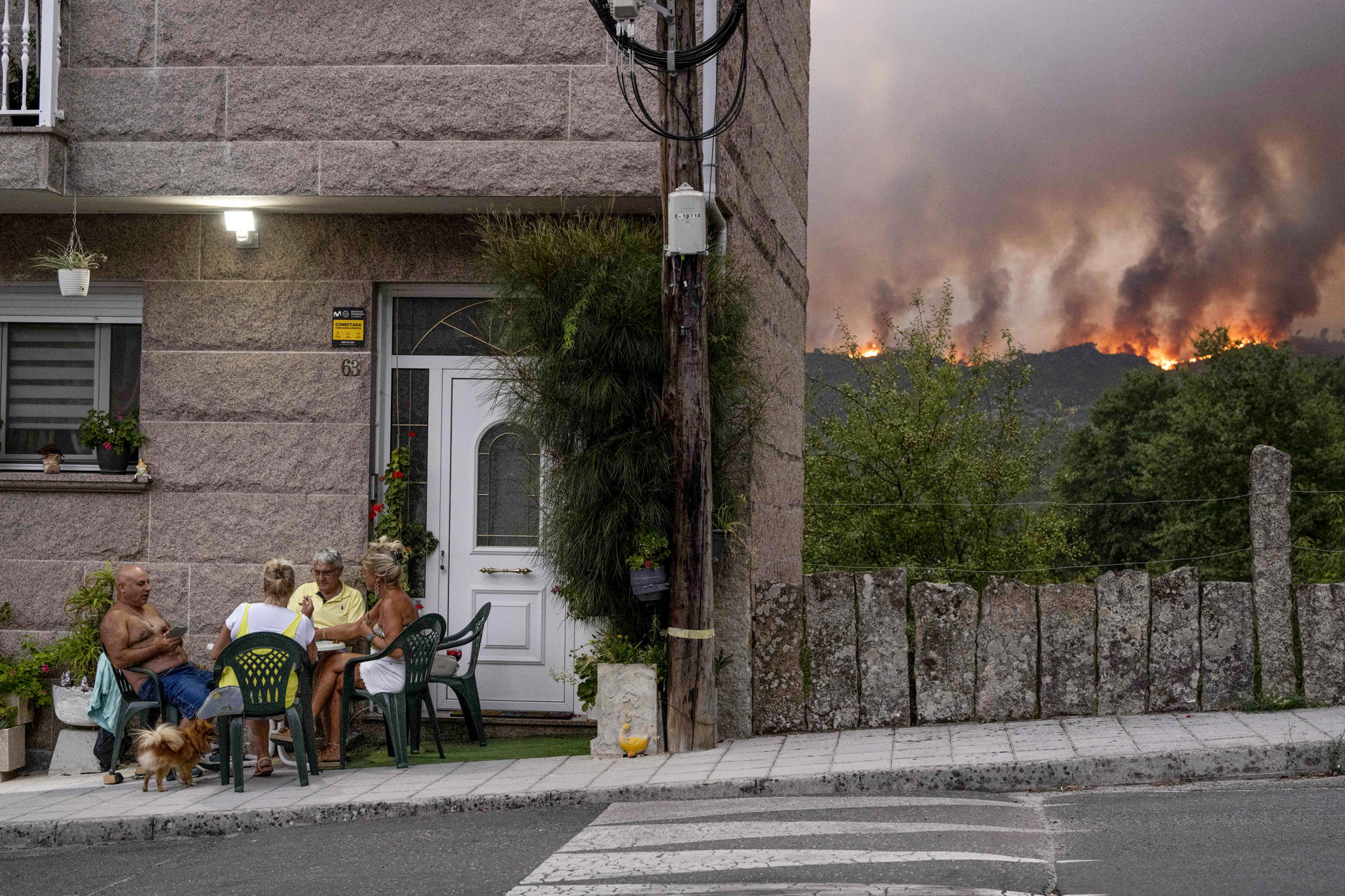 Vecinos de Carballeda de Avia, en Orense toman el fresco a la puerta de su casa mientras el fuego consume el bosque detrás de ellos
