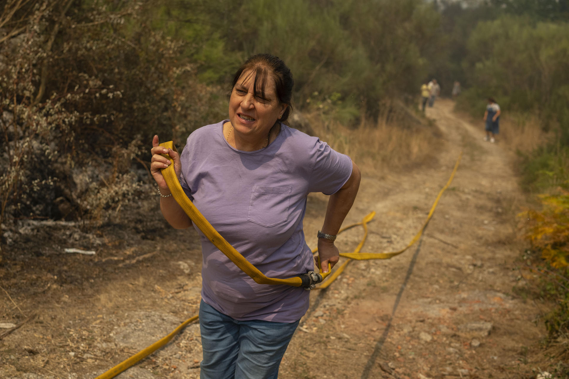 Otra vecina de Carballeda de Avia en Orense intenta sofocar el fuego transportando una manguera hacia uno de los focos del incendio