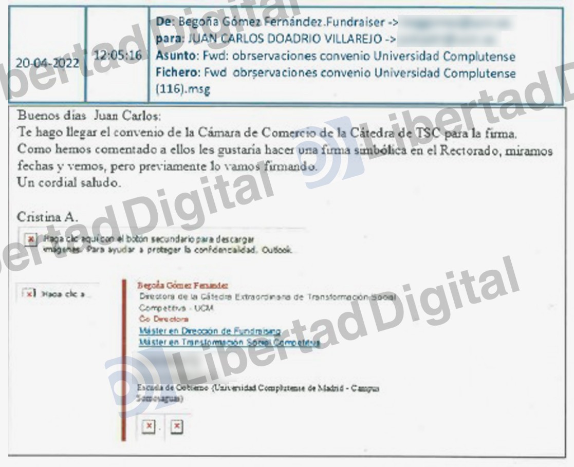 "Finalmente, en una nueva comunicación relacionada con este asunto, el día 21.04.2022, LUENGO —Cámara de Comercio— mantiene como destinatarias las cuentas de GÓMEZ y ÁLVAREZ. Sin embargo, se dirige a esta última en el cuerpo del correo, remitiendo el borrador del convenio a firmar: ‘Buenos días, Cristina. Te envío el convenio en Word. Un saludo’. Seguidamente, ÁLVAREZ lo remite a DOADRIO, el cual se lo devuelve una vez firmado: ‘Hola Cristina, Ahí va firmado. Abrazo Juan Carlos’", señala la UCO.