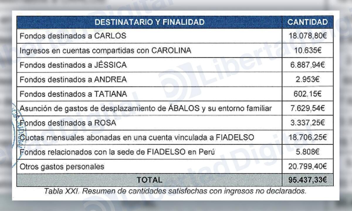 De ese total, la Guardia Civil hace un interesante desglose sobre los pagos a las prostitutas con las que le ponía en contacto Koldo. En concreto, detalla que 6.887,94 euros habrían ido a "Jéssica", la ex pareja de Ábalos contratada en Tragsatec e Ineco, donde cobraba sin trabajar por orden del ex ministro. Además, se observan 2.953 euros a "Andrea", otra de las novias de quien fuera mano derecha de Pedro Sánchez. Además, 602,15 euros a "Tatiana" y 3.337,25 euros a "Rosa", que podría ser una trabajadora del hogar. Los 18.000 euros que se contemplan y que están asociados a Carlos, corresponderían al hijo del ex ministro.