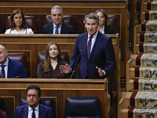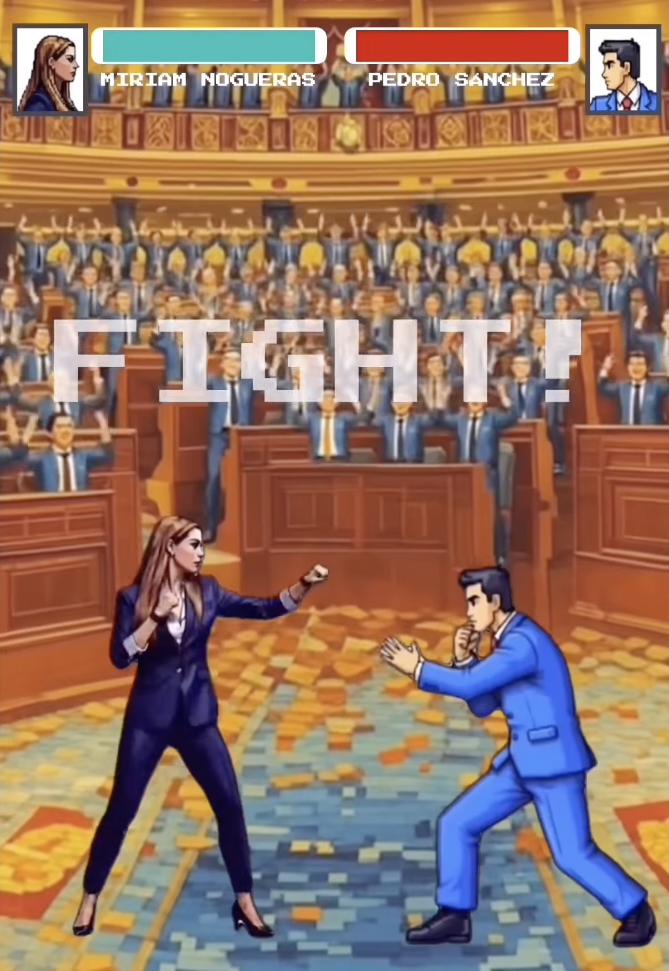 Una rubia despampanante con traje de chaqueta y pantalón azul oscuro se enfrenta con un sujeto que luce un traje azulón y corbata roja. La primera es una estilizada simulación de la portavoz de Junts en el Congreso de los Diputados, Míriam Nogueras. El otro tipo, el presidente del Gobierno, Pedro Sánchez. Ambos se enfrentan en el Congreso, una pelea a muerte donde Nogueras reparte estopa y Sánchez encaja y encaja hasta que finalmente es destruido por un violento y luminoso empujón de su contrincante.