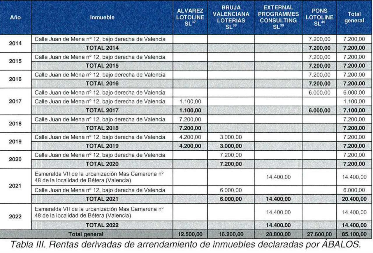 en la urbanización Mas Camarena n° XX de la localidad de Bétera (Valencia), ÁBALOS ha señalado haber recibido, entre los años 2021 y 2022, de la sociedad EXTERNAL PROGRAMMES CONSULTING SL un monto total de 28.800 €". Y esa sociedad es "propiedad de su hijo VÍCTOR ÁBALOS".