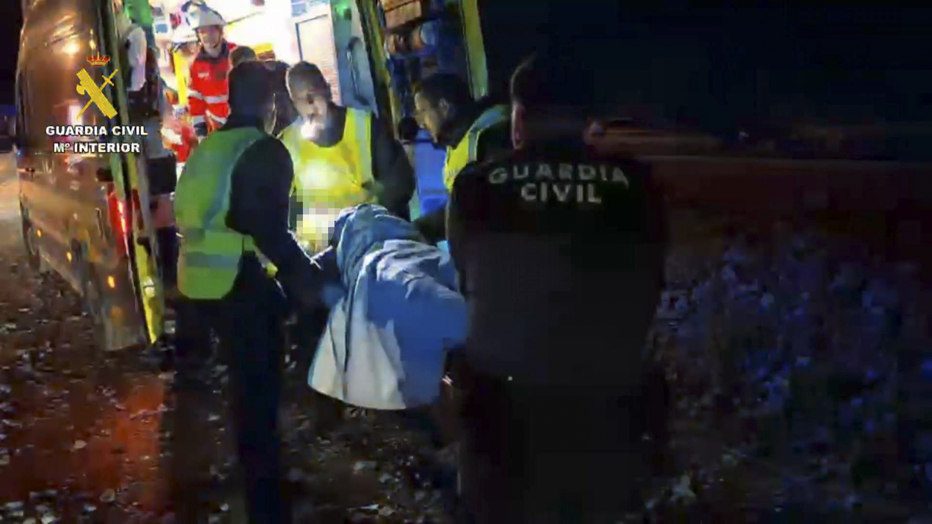Agentes de la Guardia Civil y sanitarios trasladan a una ambulancia a uno de los heridos.