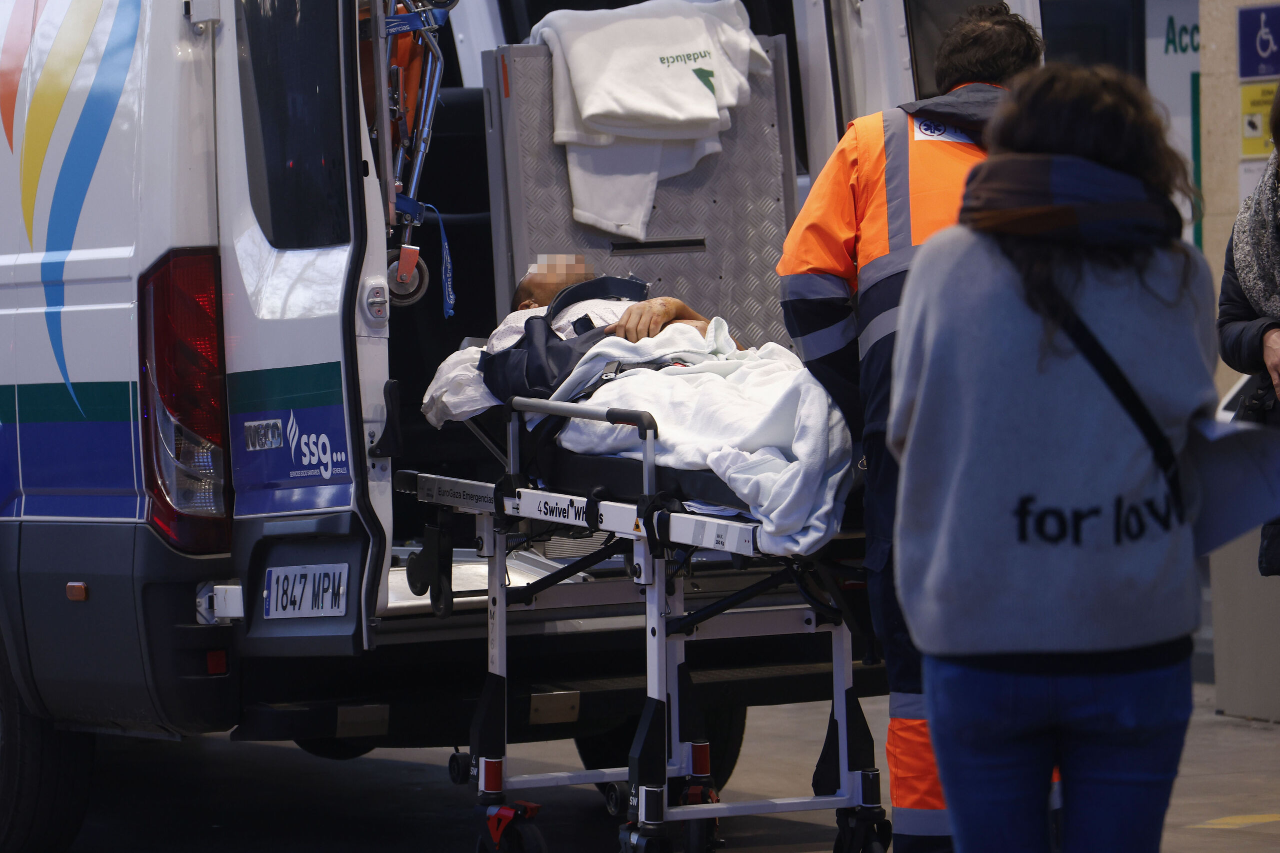 Traslado de uno de los heridos en el accidente a las urgencias del Hospital Reina Sofía en Córdoba.