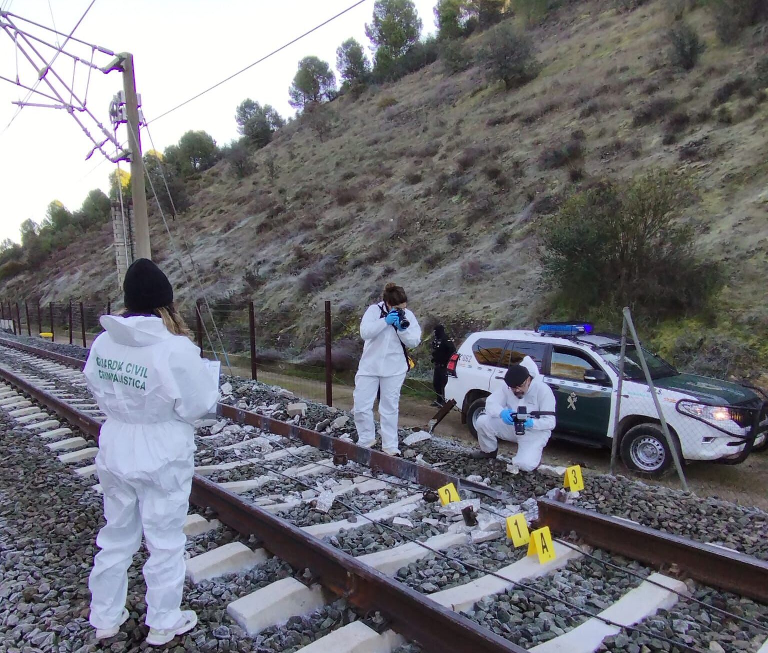 Agentes de la Guardia Civil y cuerpos de rescate ante los restos tras el descarrilamiento de un tren de alta velocidad que ha chocado contra otro que circulaba por la vía contigua en sentido contrario a la altura de la localidad de Adamuz.