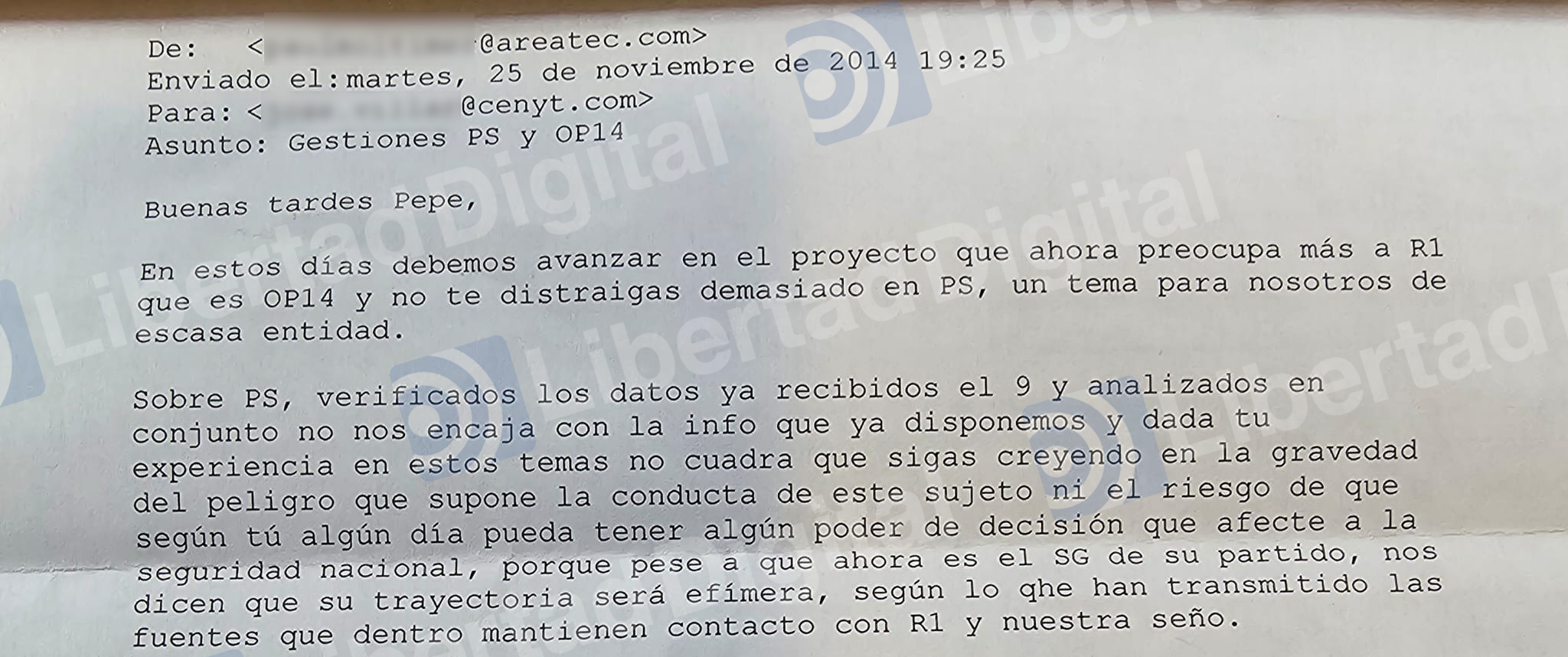 La contestación del CNI a las advertencias de Villarejo sobre Pedro Sánchez que desvela este diario se produjo concretamente el 25 de noviembre de 2014 a las 19:25 horas con el asunto "Gestiones PS y OP14". Un agente de la Inteligencia Española escribe un email al comisario desde una cuenta de correo electrónico que utiliza el dominio "areatec.com". Este dominio encubierto, no oficial, lo utilizó el servicio de inteligencia español durante años para comunicaciones sensibles, correos electrónicos y operaciones.