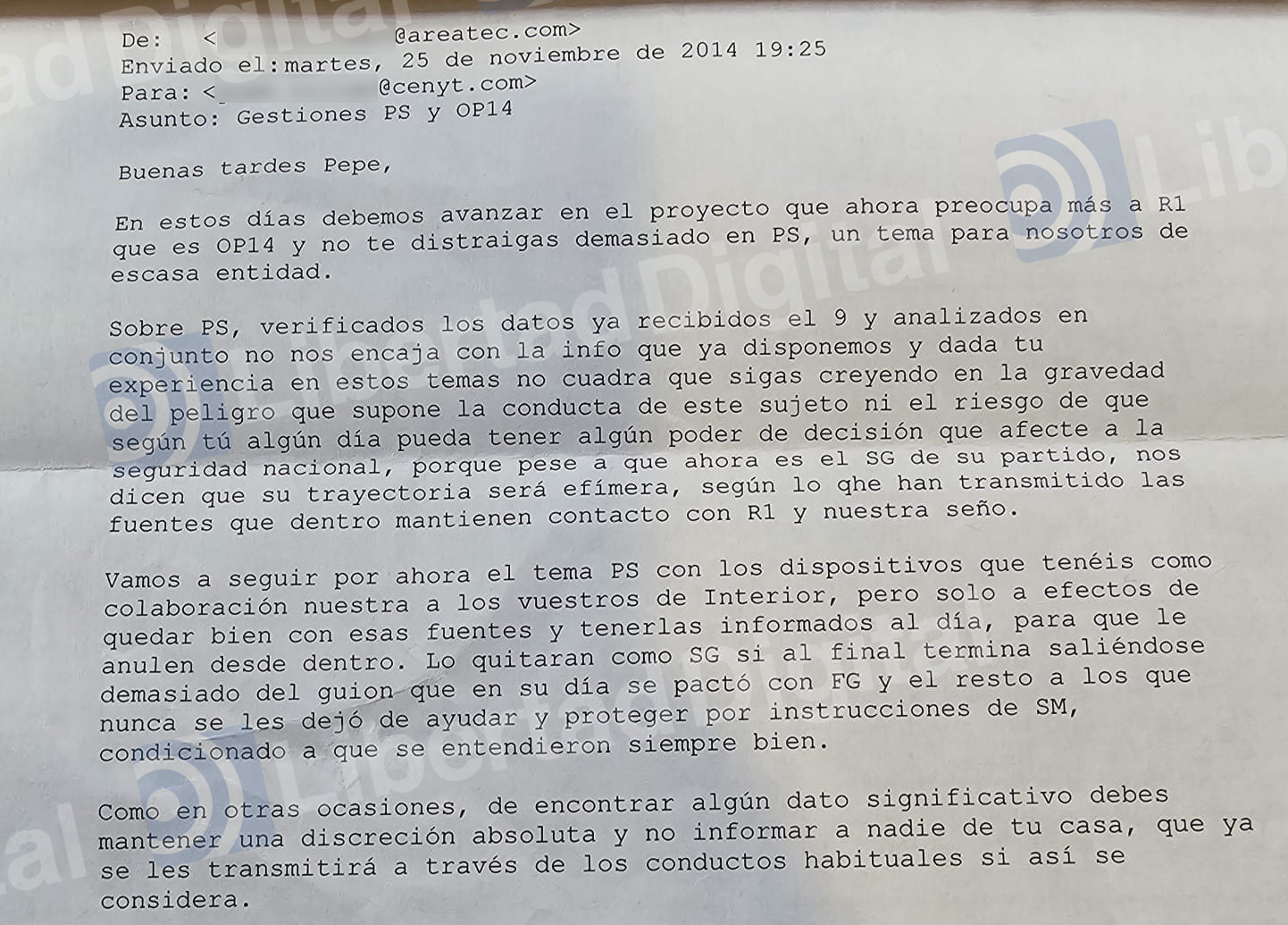 La contestación del CNI a las advertencias de Villarejo sobre Pedro Sánchez que desvela este diario se produjo concretamente el 25 de noviembre de 2014 a las 19:25 horas con el asunto "Gestiones PS y OP14". Un agente de la Inteligencia Española escribe un email al comisario desde una cuenta de correo electrónico que utiliza el dominio "areatec.com". Este dominio encubierto, no oficial, lo utilizó el servicio de inteligencia español durante años para comunicaciones sensibles, correos electrónicos y operaciones.