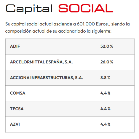 Según la propia página web de la empresa Redalsa, su capital social actual asciende a 601.000 euros, siendo la composición actual de su accionariado la siguiente: Adif 52%; ArcelorMittal España S.A. 26%; Acciona Infraestructuras S.A. 8,8%; Comsa 4,4%; Tecsa 4,4%; y Azvi también un 4,4%.
