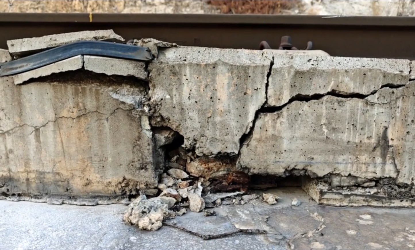 "Pásate por allí, que (los trenes) están pasando despacio", le dijeron, "porque un maquinista anunció que hay un bache allí de la hostia". Cuando el trabajador de mantenimiento de Adif llega al lugar, se encuentra con que "la base, la placa de la vía, justo en una junta de hormigón, se ha partido por debajo", comenta al tiempo que se muestran las imágenes de la rotura, que ha generado un desnivel en la vía "al estar una placa más alta que otra".