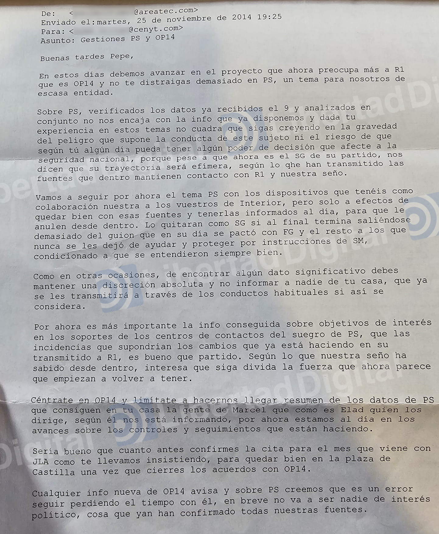 La contestación del CNI a las advertencias de Villarejo sobre Pedro Sánchez que desvela este diario se produjo concretamente el 25 de noviembre de 2014 a las 19:25 horas con el asunto "Gestiones PS y OP14". Un agente de la Inteligencia Española escribe un email al comisario desde una cuenta de correo electrónico que utiliza el dominio "areatec.com". Este dominio encubierto, no oficial, lo utilizó el servicio de inteligencia español durante años para comunicaciones sensibles, correos electrónicos y operaciones.