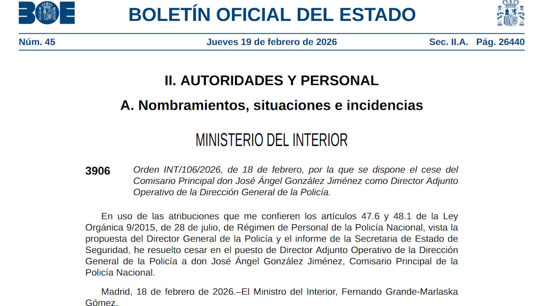La publicación no ha aparecido en edición ordinaria de este jueves, sino en un número extraordinario difundido varias horas después, en torno a las 13.15 horas, una fórmula reservada habitualmente para decisiones que el Gobierno considera importantes. Con ello, el Ministerio del Interior da cobertura legal inmediata al relevo en la cúpula policial tras el terremoto institucional desatado esta semana.