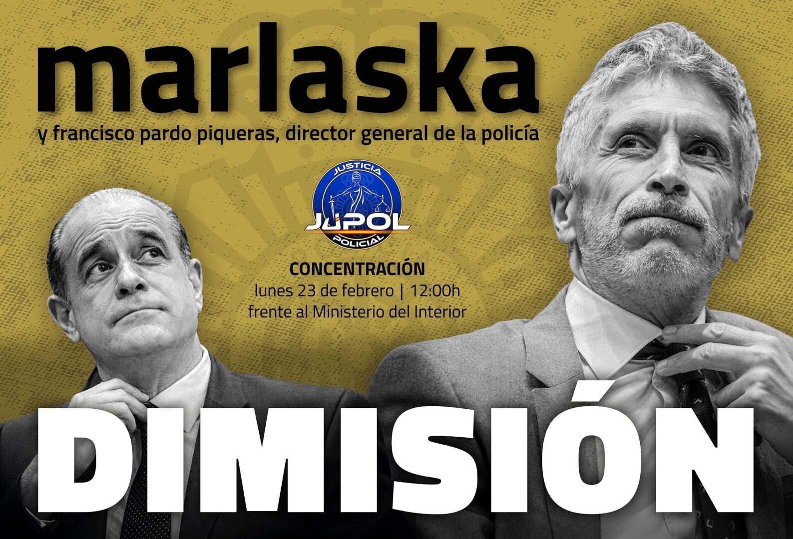 Justicia Policial (JUPOL), uno de los sindicatos mayoritarios en el Consejo de la Policía Nacional, ha convocado a los agentes del cuerpo, miembros de otros cuerpos de seguridad y a todos los ciudadanos que quieran a concentrarse este próximo lunes 23 de febrero a las 12.00 horas frente a la sede del Ministerio del Interior en el Paseo de la Castellana. El objetivo es forzar a Marlaska ha dejar su puesto.