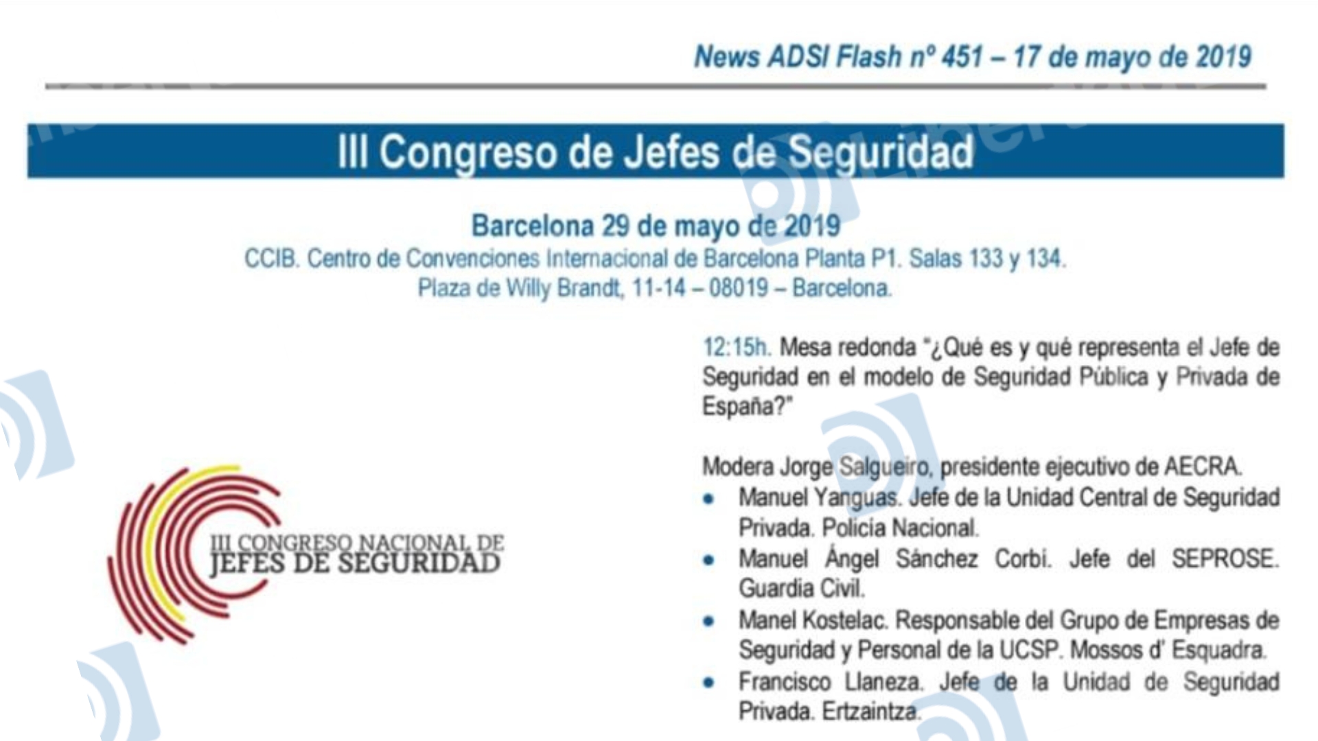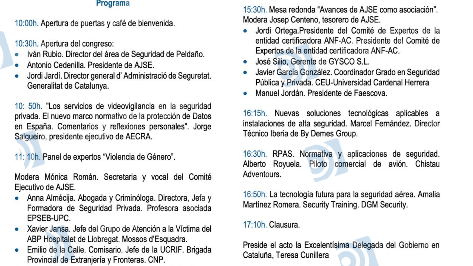 Allí se encontraban "Manuel Yanguas. Jefe de la Unidad Central de Seguridad Privada. Policía Nacional"; "Manuel Ángel Sánchez Corbí. Jefe del SEPROSE. Guardia Civil"; "Manel Kostelac. Responsable del Grupo de Empresas de Seguridad y Personal de la UCSP. Mossos d’ Esquadra"; "Francisco Llaneza. Jefe de la Unidad de Seguridad Privada. Ertzaintza"; "Jordi Jardí. Director general d’ Administració de Seguretat. Generalitat de Catalunya"; y hasta presidía el acto "la Excelentísima Delegada del Gobierno en Cataluña, Teresa Cunillera". Traducido: que contaba con todo el respaldo y conocimiento del Gobierno y de la Generalidad Catalana.